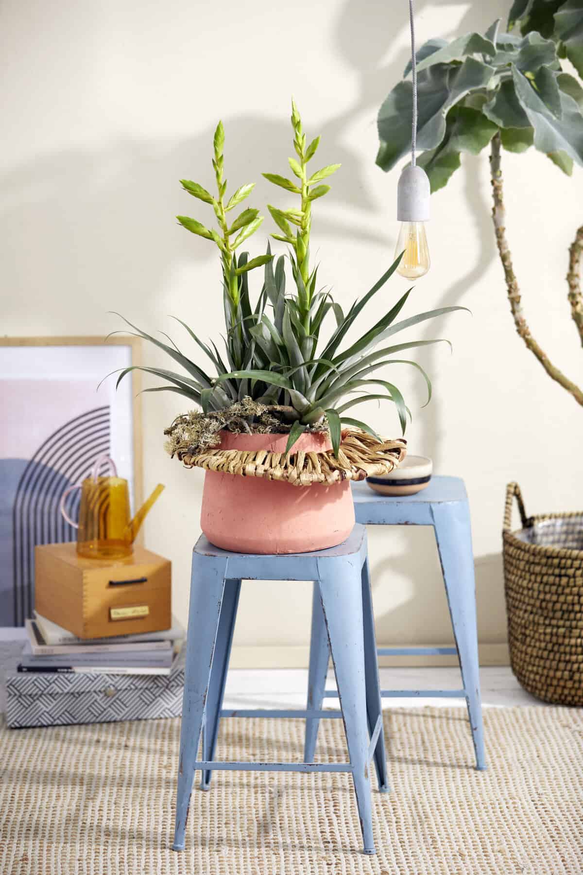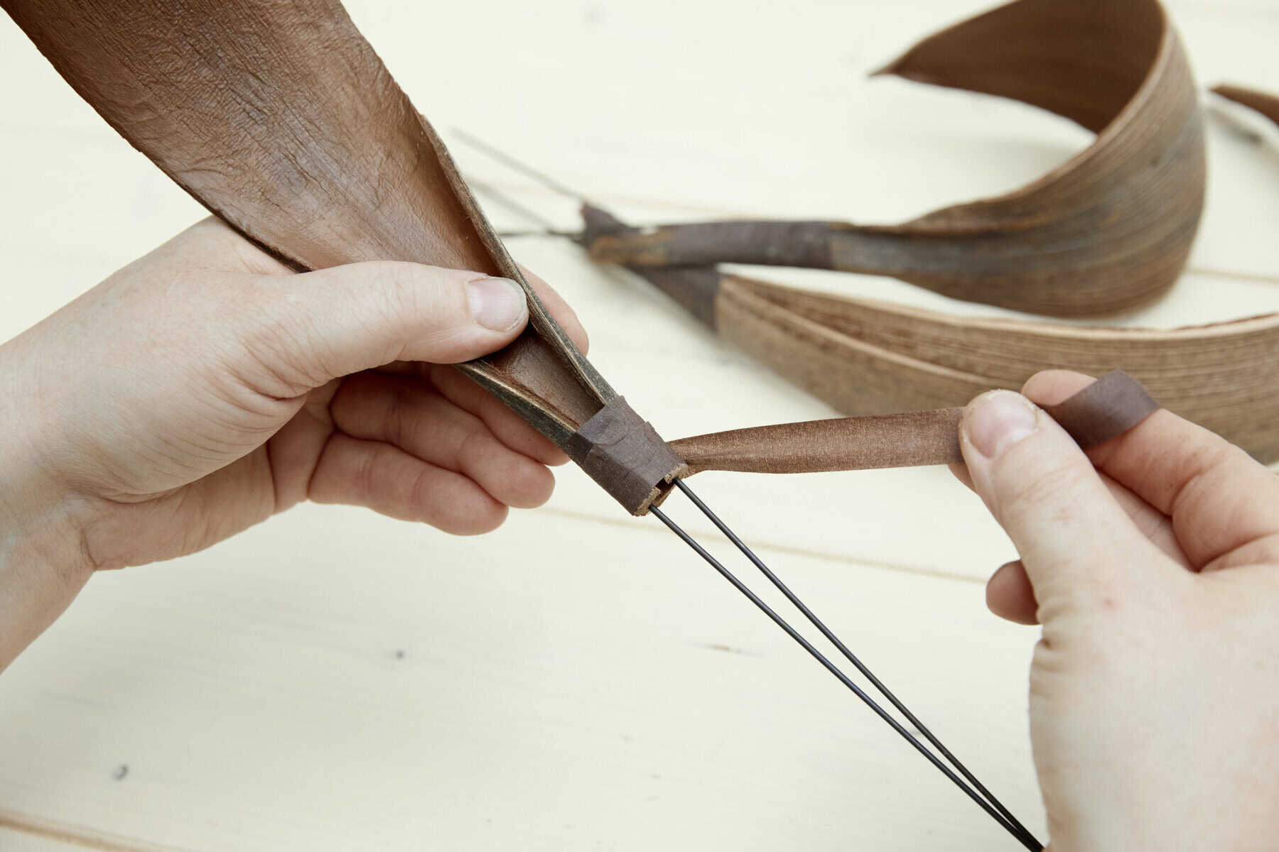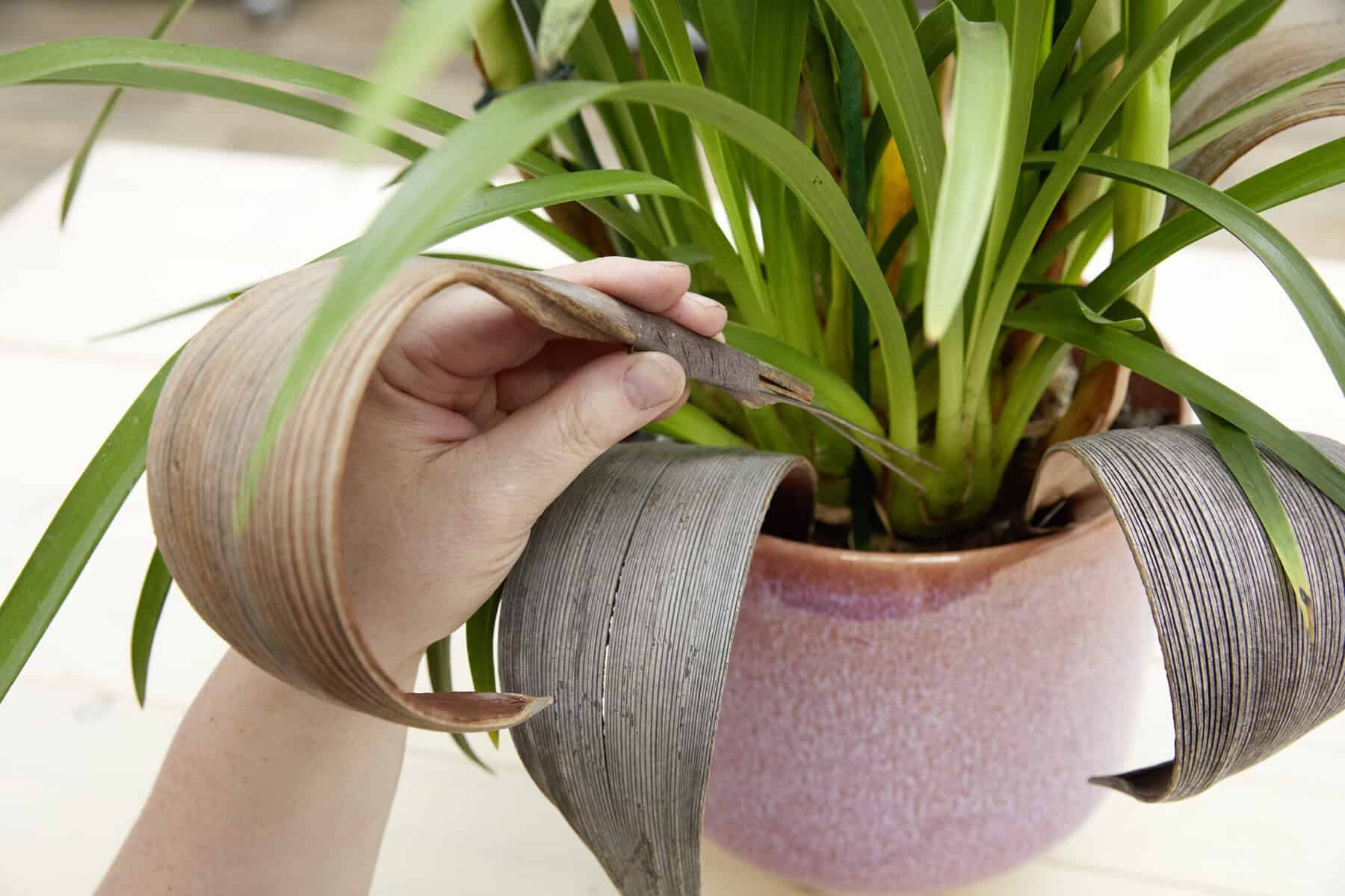 Die Kokospalmenblätter mit Steckdraht andrahten. Cymbidium in das Gefäß setzen und die angedrahteten Blätter rundherum in der Pflanzerde fixieren. Die Zwischenräume mit Evernia ausfüllen.