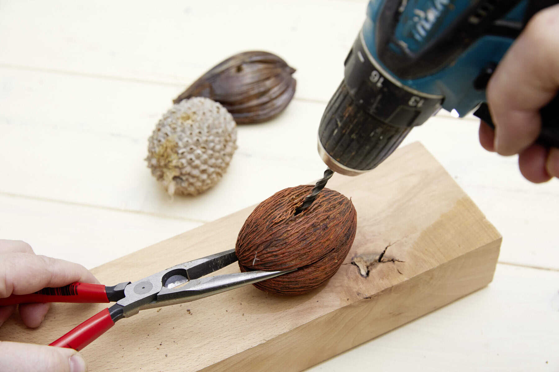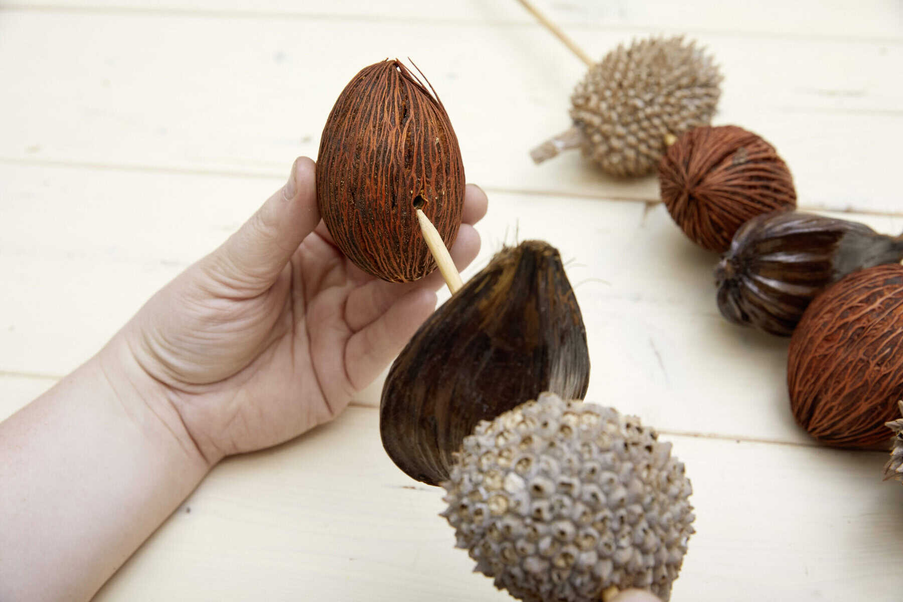 Die Früchte jeweils mittig durchbohren. Dann nacheinander auf die Tonkinstäbe stecken. Die Pflanze in das Gefäß setzen und die Spieße ergänzen.