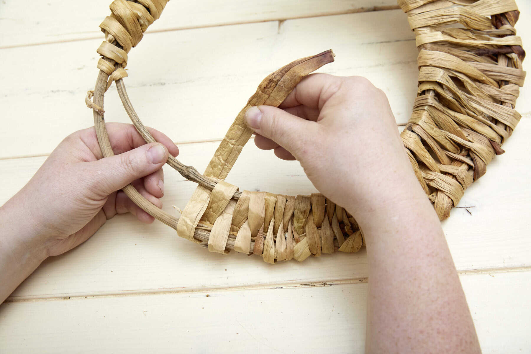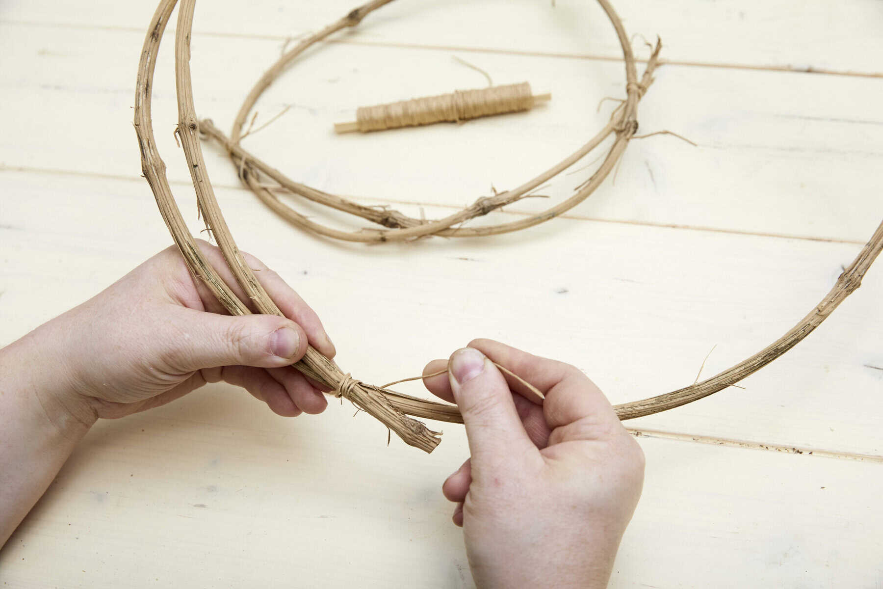 Eichhornia wässern. Aus Clematis-Ranken zwei unterschiedlich große Ringe erstellen. Diese an einer Stelle mit Bindedraht zusammenfassen. Die Ringe versetzt übereinander legen und großzügig mit eingeweichter Eichhornia umwickeln. Die entstandene Scheibe über das Gefäß legen und dieses bepflanzen. Evernia ergänzen.