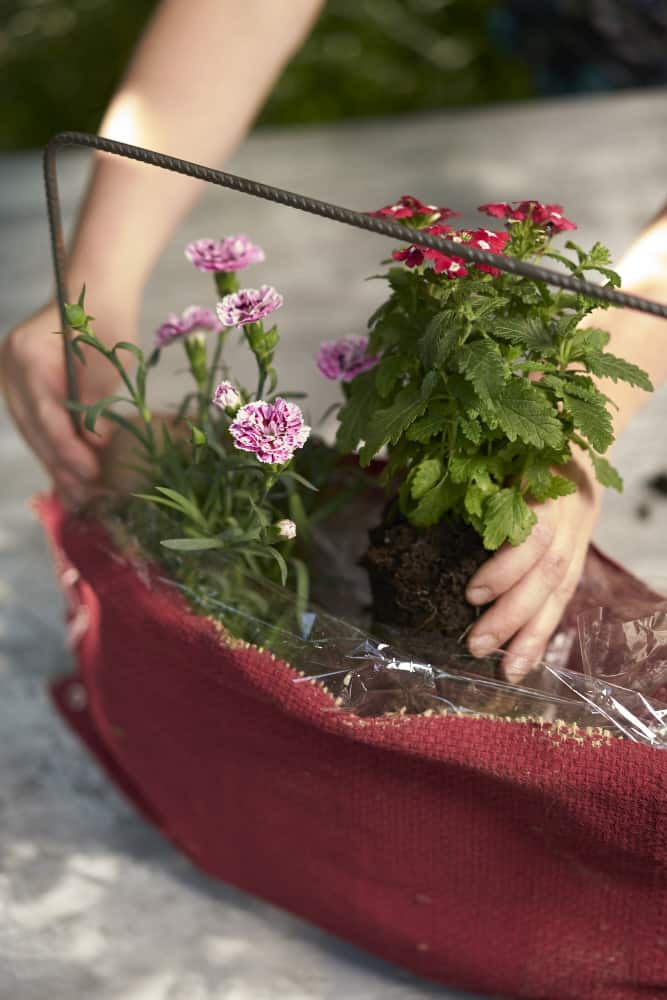 Die Jute um den Rahmen legen und Kabel oder stabile Schnur durch die Ösen fädeln, sodass die Seiten geschlossen werden. Die so entstandene Tasche mit Folie auslegen und mit Erde sowie Pflanzen füllen.