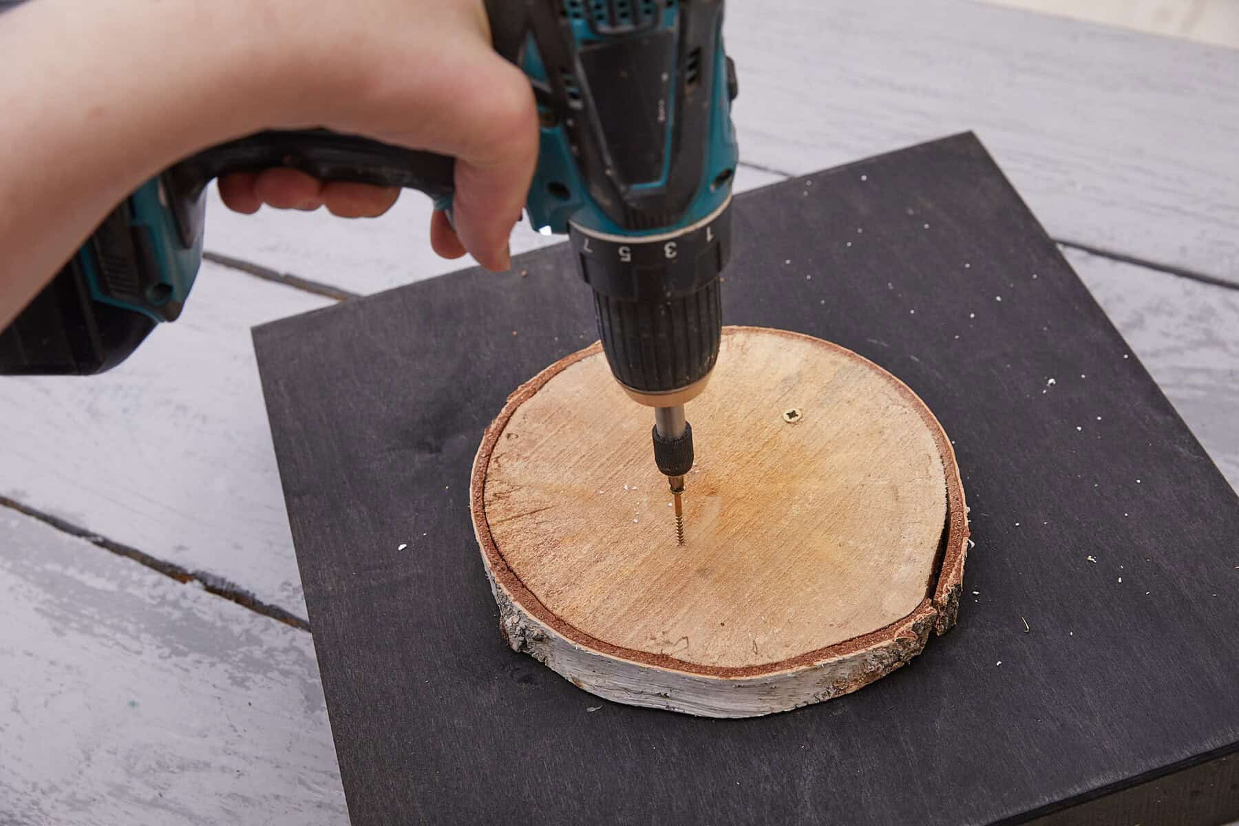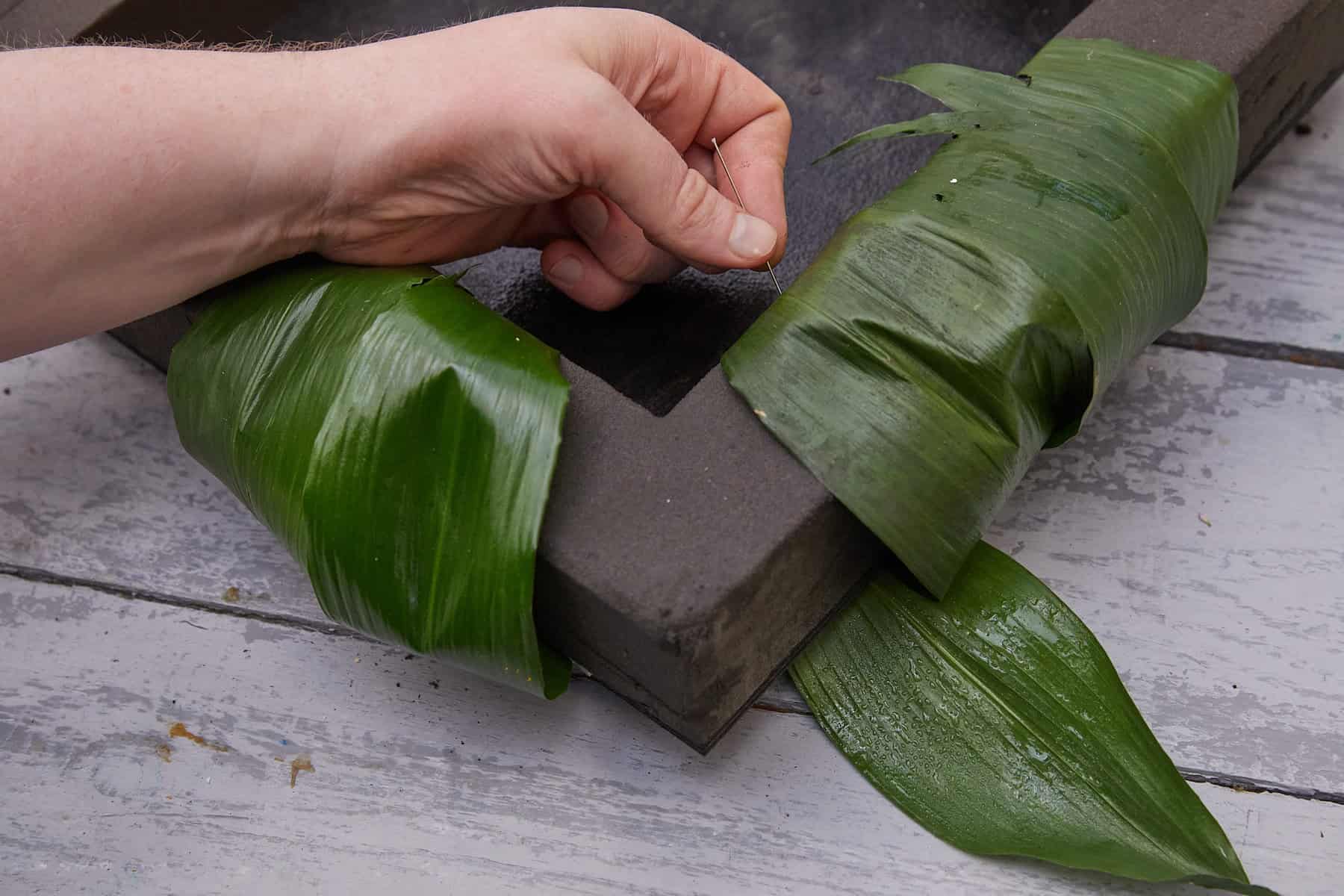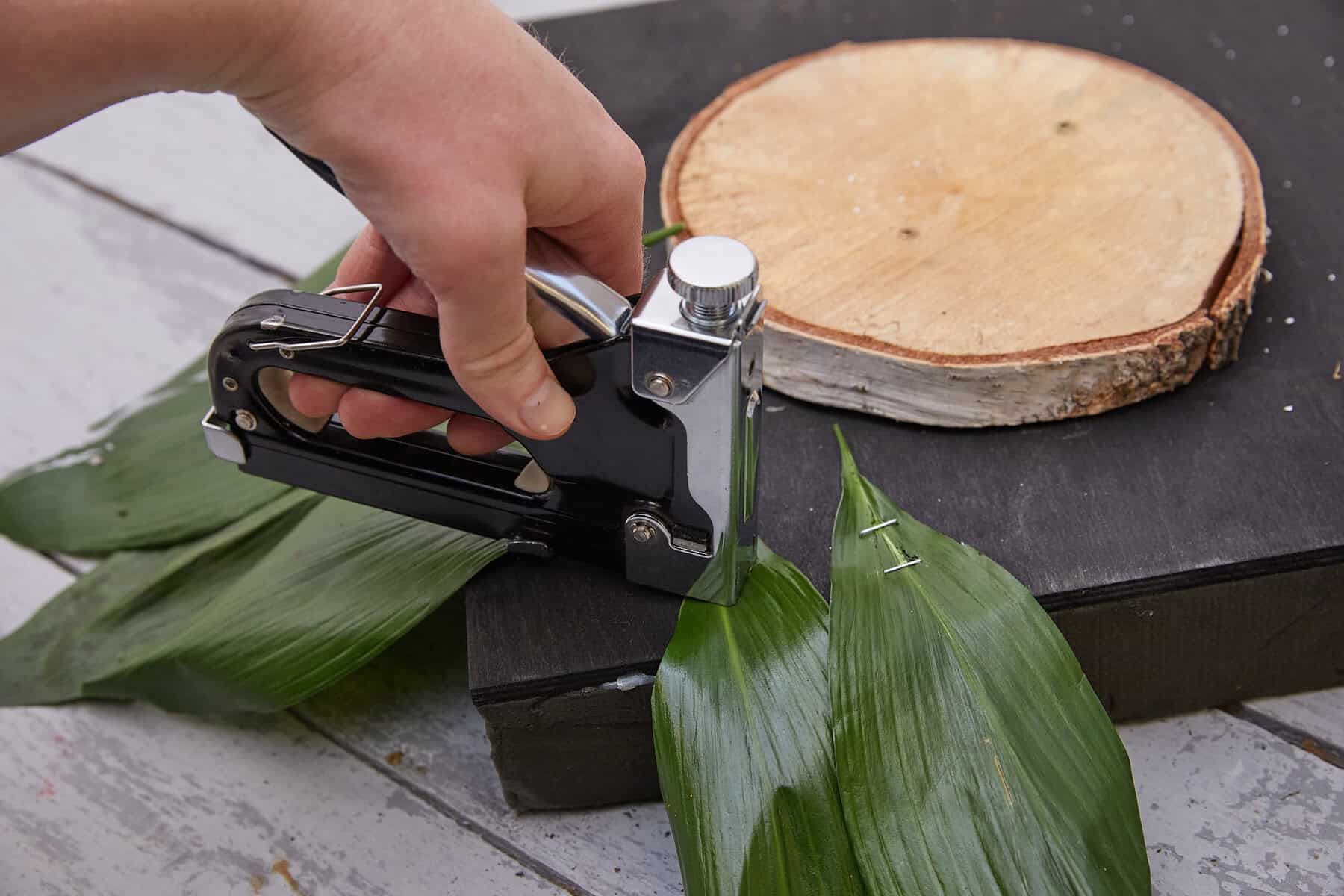 Baumscheibe als Abstandshalter unter die gewässerte Steckunterlage schrauben. Blätter der Schusterpalme an der Steckunterseite festtackern. Blattspitzen mit Stecknadeln an der Innenseite der Unterlage befestigen. Anschließend Floralien einarbeiten und die Urne mittig platzieren.