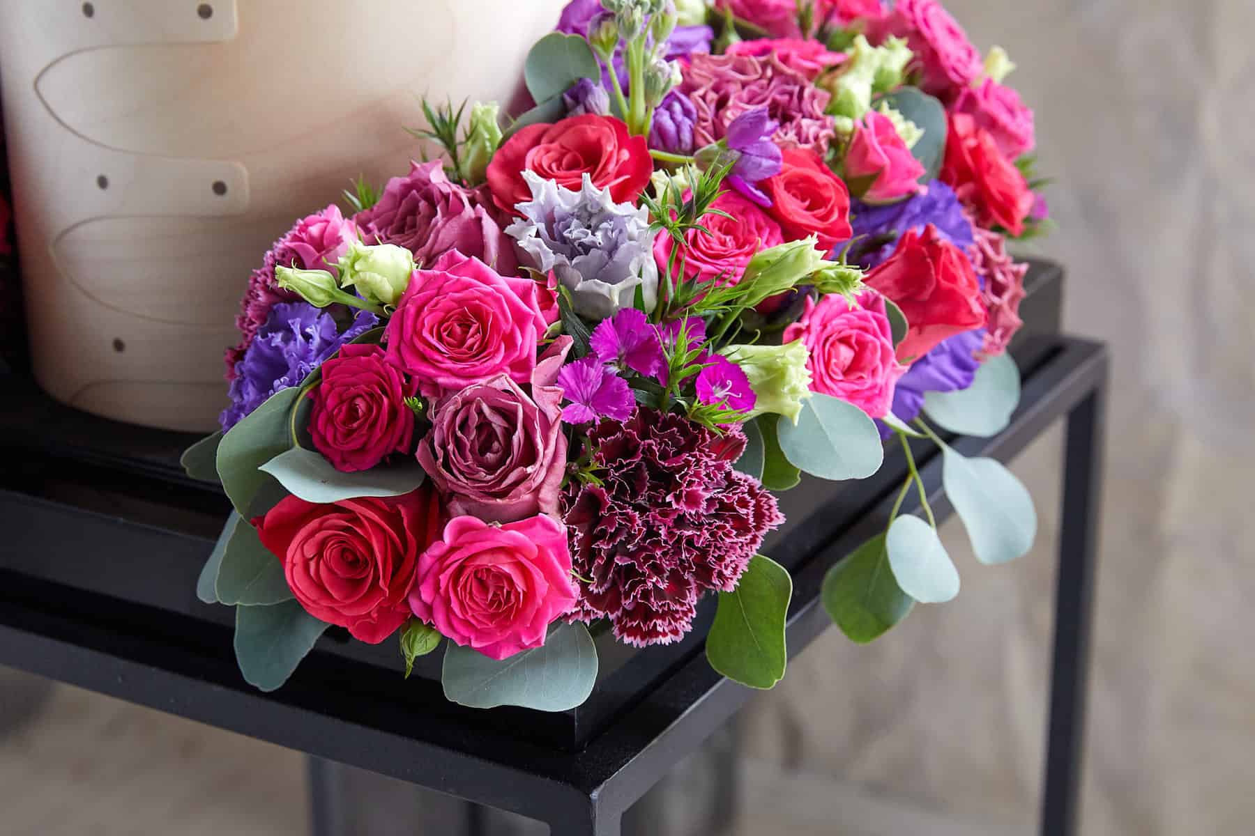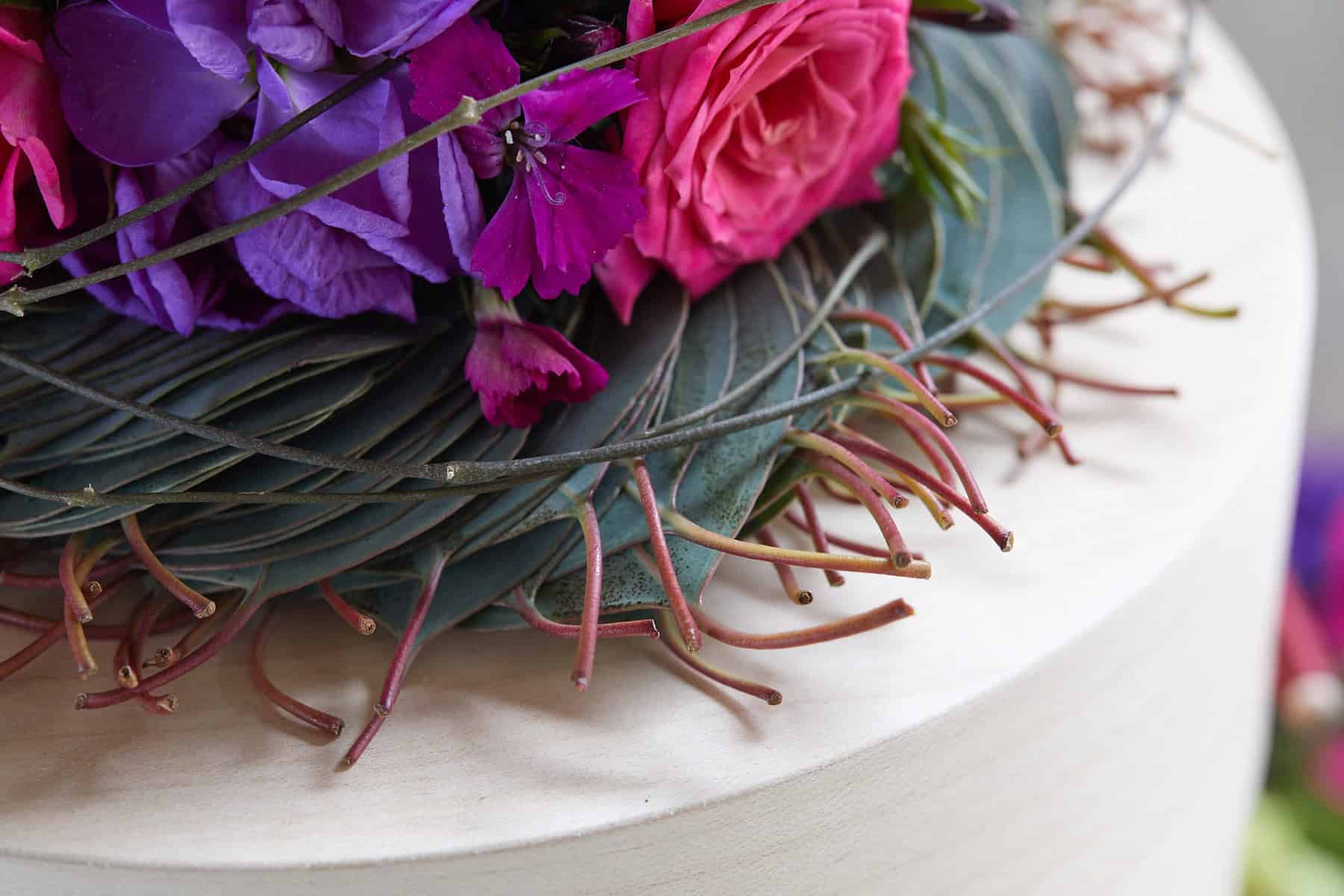 Urnen Deko: Die Steckunterlage wässern. Anschließend die Eukalyptusblätter auf Draht auffädeln und zum Kranz biegen. Nun den Blätterkranz mithilfe von Stecknadeln unter Steckunterlage/ Urnen Deko befestigen und die Floralien stecken. Dann die Ranke locker über das Werkstück legen und fixieren. Zum Schluss das Werkstück auf der Urne platzieren.