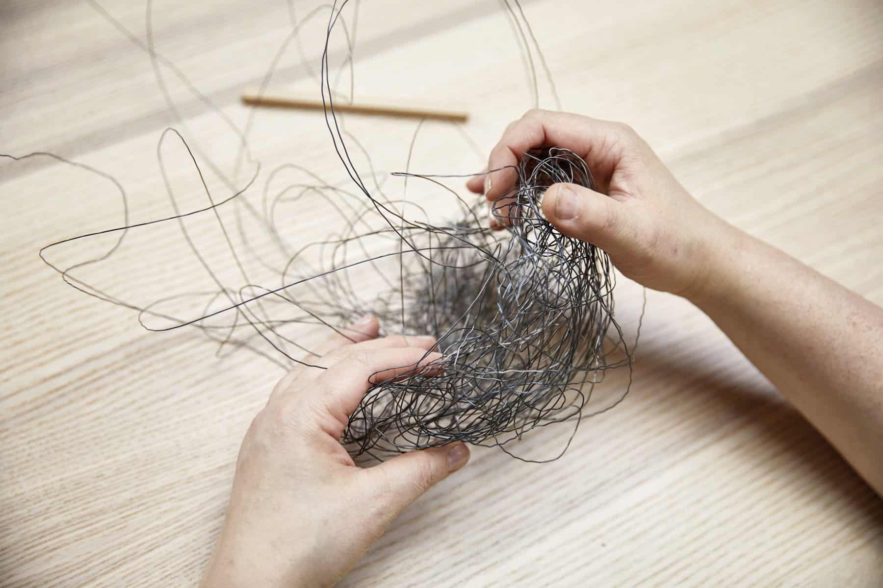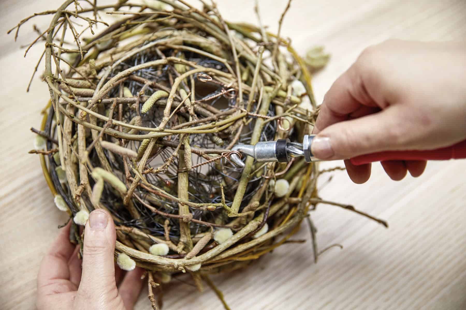 Wickeldraht abspulen und zu einem Nest zusammenknautschen. Zweige in das so entstandene Drahtgerüst stecken und mithilfe von Twister und Twistdraht punktuell befestigen. Nach und nach weitere Zweige hinzustecken, sodass die Nestform entsteht. Eine Baumstammscheibe in das Nest einlegen, eine Primel mit Topf hineinstellen und Tulpenzwiebeln sowie Federn ergänzen.