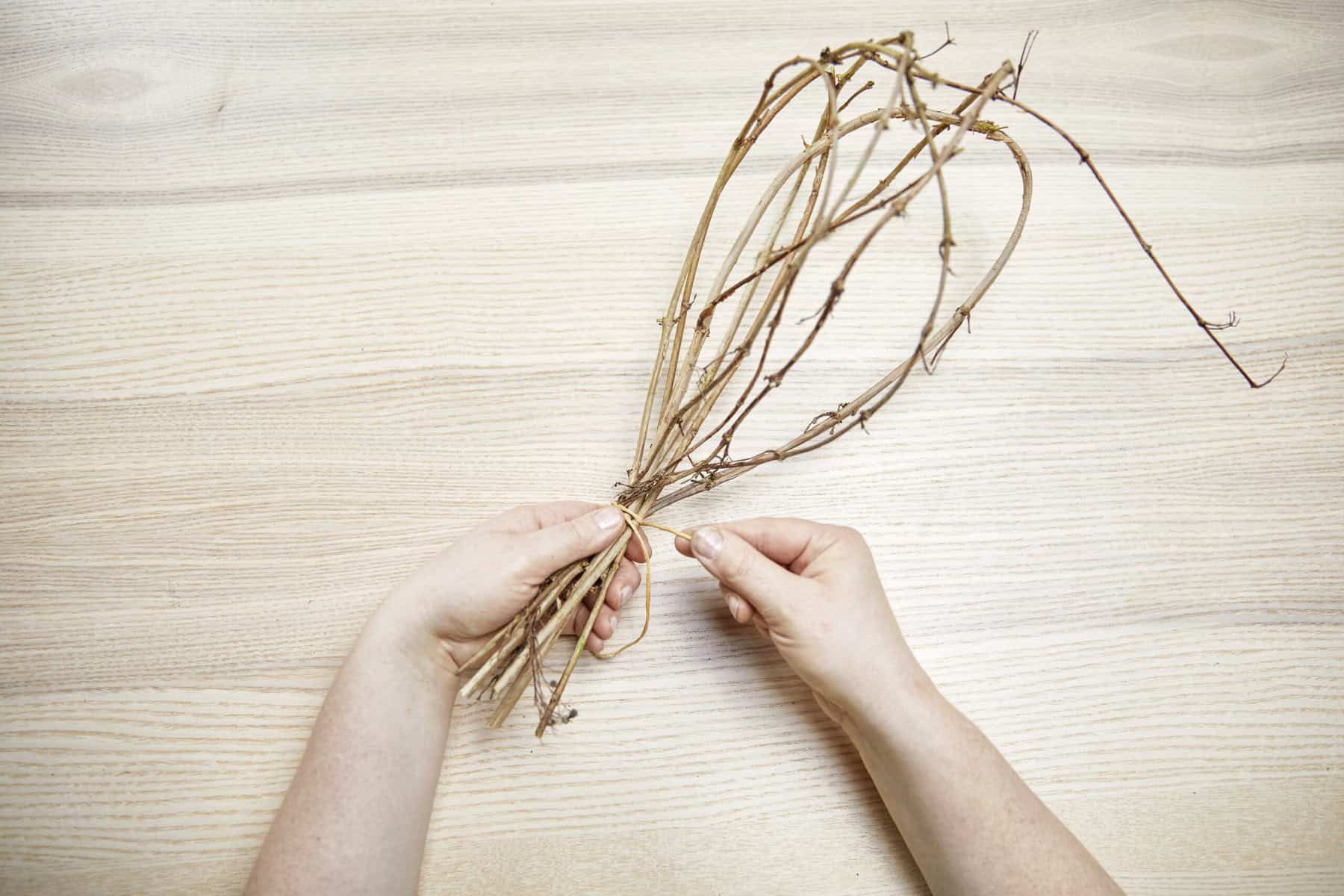 Biegsame Zweige tropfenförmig zusammenfassen und an den Enden mit Rebenbindedraht fixieren. Zweige im unteren bauchigen Bereich durch waagerechtes Einflechten und Hinzufügen vergrößern und stabilisieren. Die Bindestelle mit Schnur umwickeln und eine Aufhängung fertigen. Dann eine Primel samt Gefäß einstellen und mit Federn dekorieren.