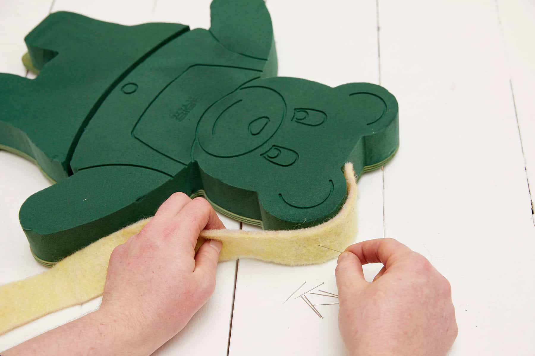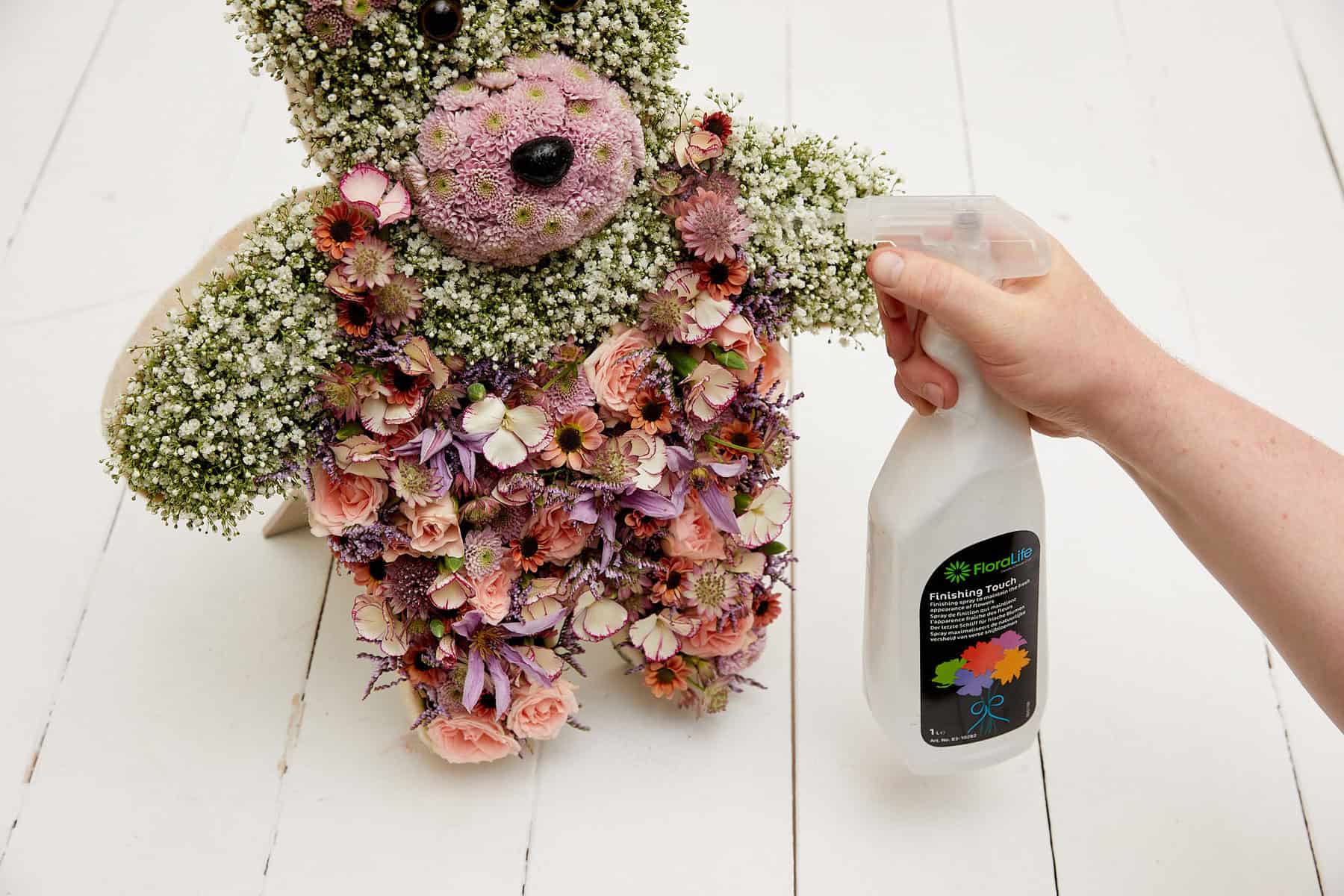 Die hölzerne Aufstellvorrichtung kolorieren, dann die Steckschaumunterlage wässern. Nun den Rand der Teddybärenform mit Filzband umlegen und dieses mittels Stecknadeln fixieren. Die Floralien einstecken, dabei entsprechend der Konturen das Gesicht mit helleren Blüten ausstecken und mit bunten, rötlichen Blüten die Latzhose nachvollziehen. Zum Schluss das Werkstück für eine bessere Haltbarkeit mit FloraLife® Finishing Touch besprühen.