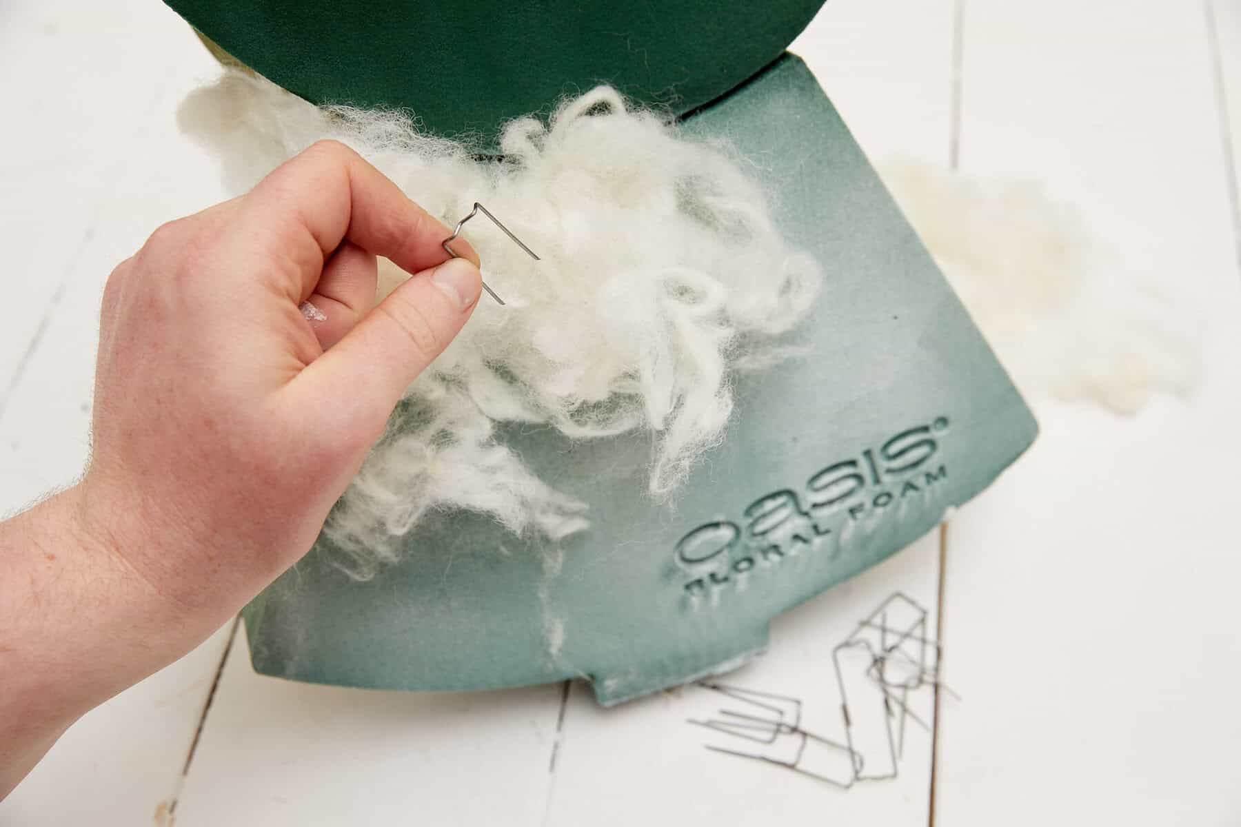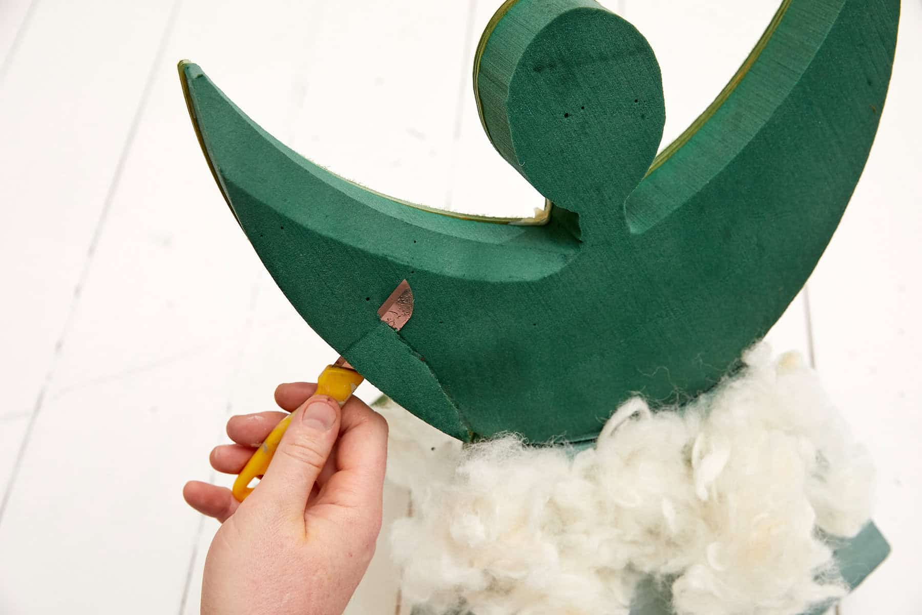 Als Erstes die hölzerne Aufstellvorrichtung kolorieren, dann die Steckschaumunterlage wässern. Nun das Kleid des Engels mit Wolle behaften. Die Steckunterlage im Bereich der Flügel etwas schmaler zurechtschneiden und die Blumen einstecken.