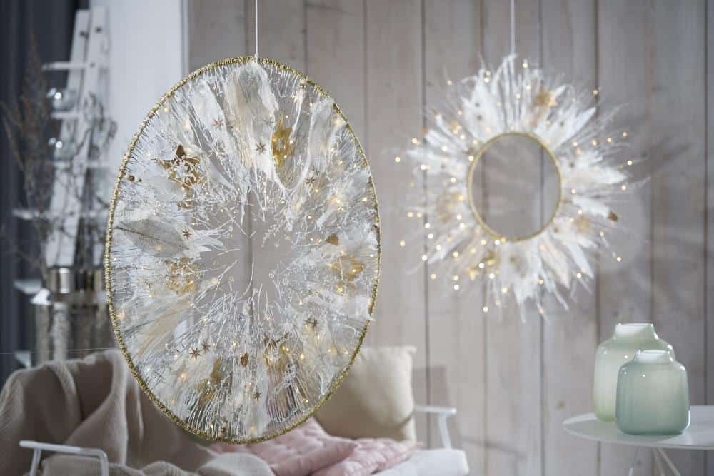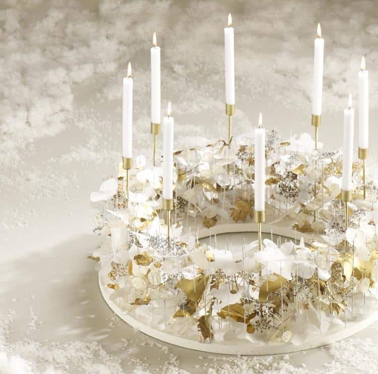 Weiß als die Farbe, die am hellsten, klarsten wahrgenommen wird, und Gold, das als metallisches Gelb höchste Wertigkeit ausdrückt, sind die typischen Farben für Weihnachten, symbolisieren sie doch den Himmel und die Ankunft Gottes auf der Erde. Insofern ist die Gestaltung eines Adventkranzes in diesen Farben aus traditioneller, farbsymbolischer Sicht ein Vorgriff auf das dem Advent folgende Weihnachtsfest. So eng werden aber Farbtraditionen heute nicht mehr betrachtet und auch sonst ist der hier zu sehende Adventskranz mit acht statt der üblichen vier Kerzen ohnehin nicht traditionell ausgerichtet. Ganz zum himmlischen Anlass des Weihnachtsfestes passen dagegen die in Farbe, Glanz und Form den Sternen abgeschauten Raumschmuckelemente in dem Bunt-Unbunt-Kontrast von Gold und Weiß.