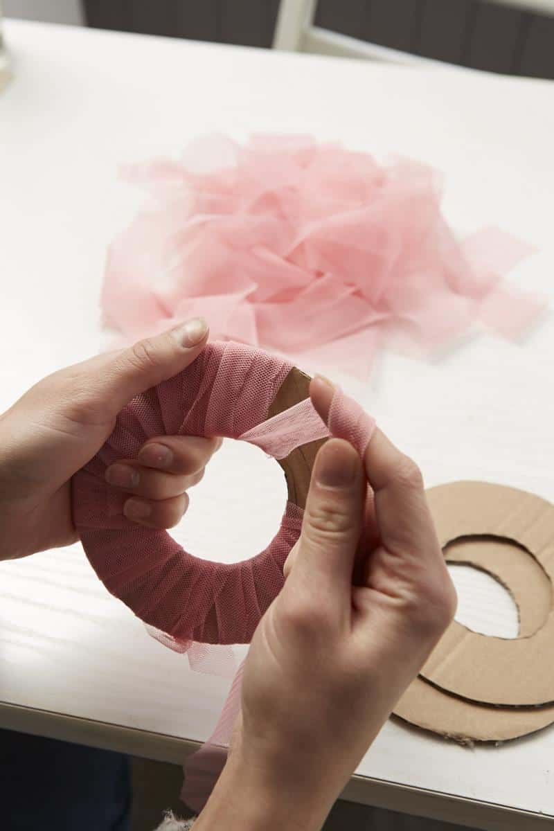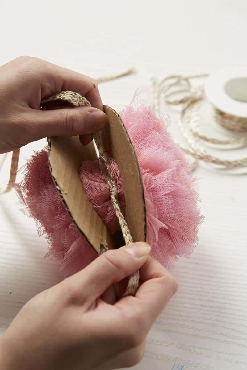 1. Für die Pompoms zwei Pappringe ausschneiden, aufeinanderlegen und zusammen mehrfach mit Band umwickeln.