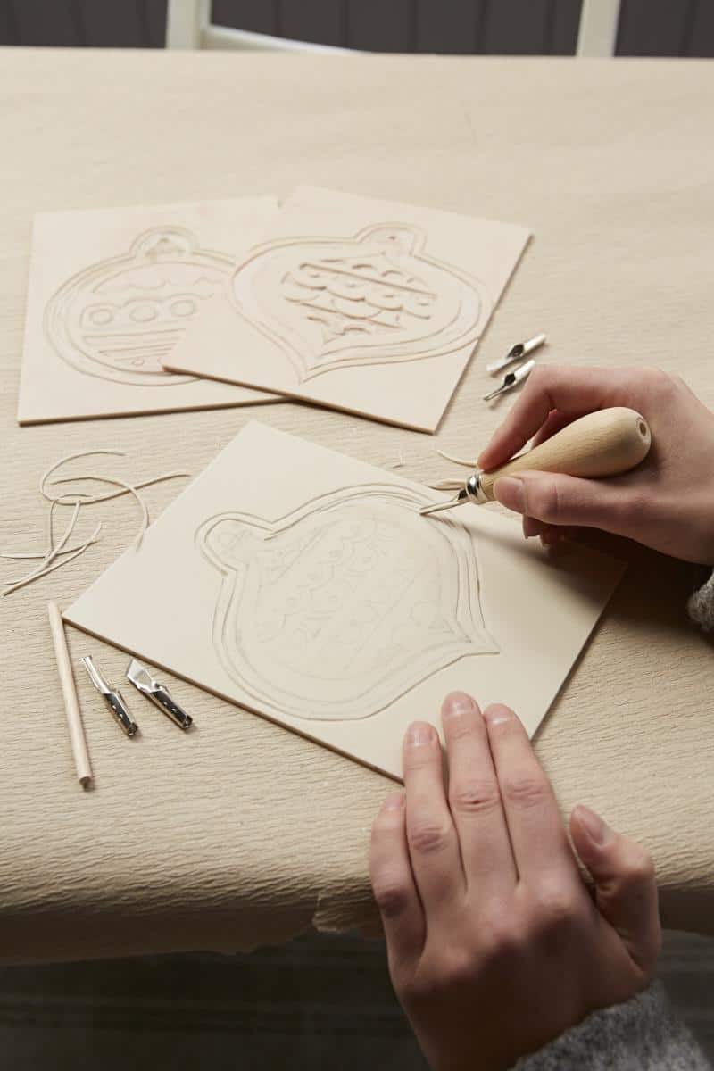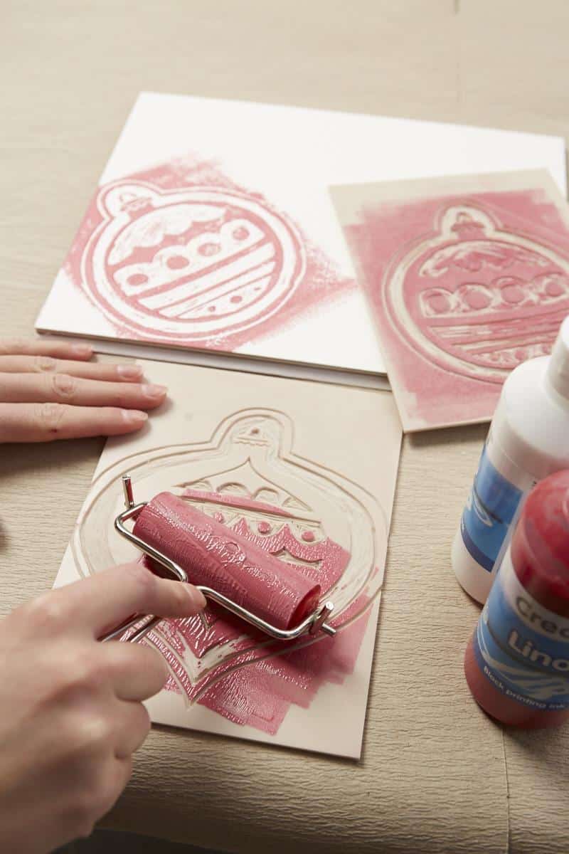 4. Für die Anhänger in Linoltechnik Motive erstellen, diese mit Linoldruckfarbe versehen und auf Pappe aufdrucken.