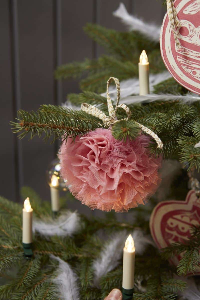 Die Kinder haben dafür Bandpompons gebastelt, sowie zu den transparenten Glaskugeln Hänger in Linoldruck mit Kugelmotiv angefertigt. Die weißen Federn sind das kleine Augenzwinkern und bringen Strahlkraft sowie Glanz ins gemütliche Heim. Und sehr zur Freude der Mädchen unterstreichen die altroséfarbenen Akzente Modernität und Wärme.