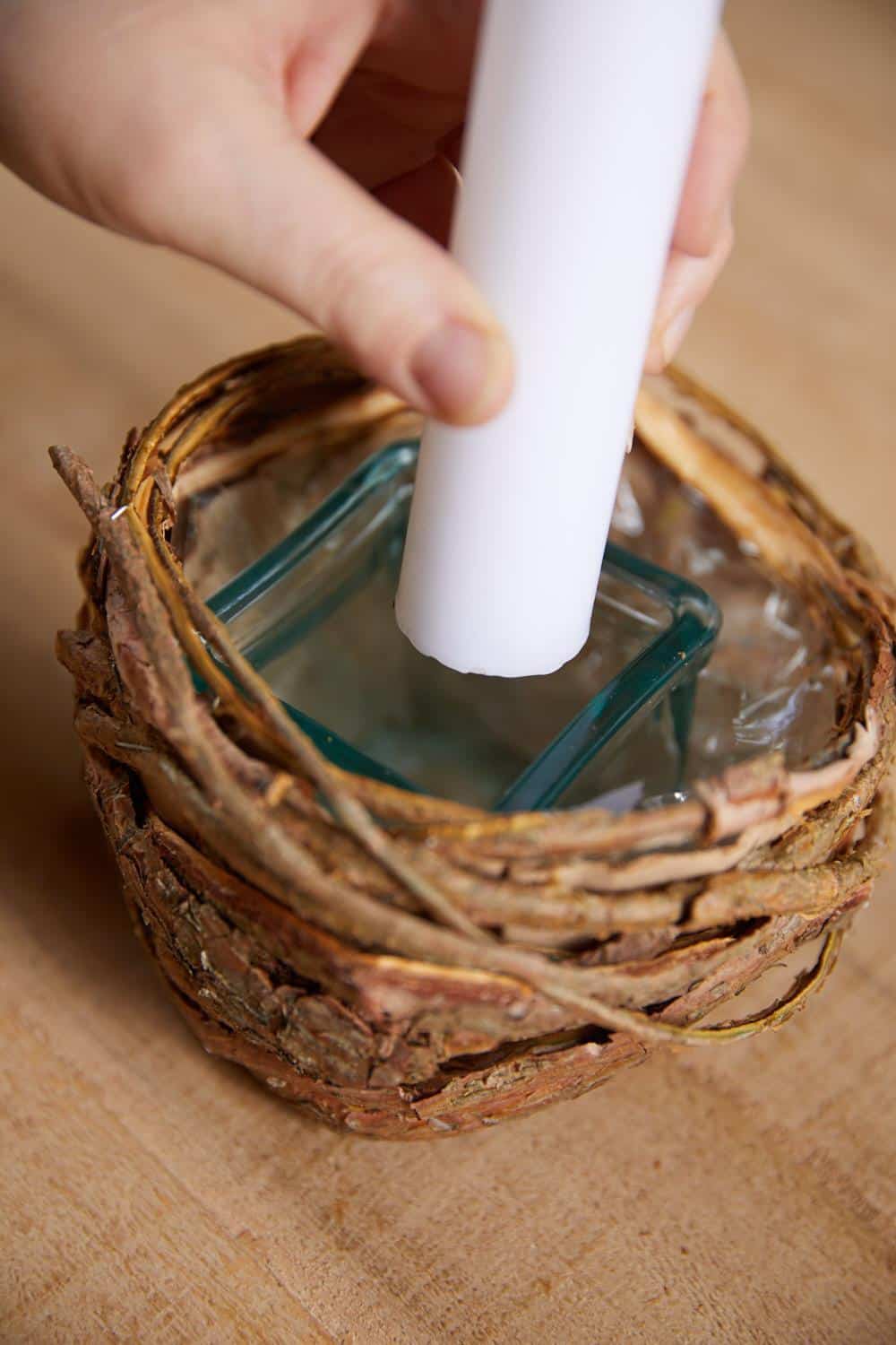 Einfach und schnell ist eine Gesteckschale aus mehreren übereinander gelegten und zusammengetackerten Kaffeefiltern gemacht, die sich mit Süßigkeiten und Zweigen füllen lässt. Für das etwas stabilere Exemplar aus Filtertüten wird das Gesteck mit abgeschälter, langer Zweigerinde ummantelt. Das Innere mit Folie auskleiden und ein Gefäß samt Kerze einstellen. Dann mit gewässertem Steckschaum ausfüllen und mit Moos, Koniferentrieben und allerlei natürlichem Weihnachtsschmuck sowie Bandschleifen schmücken.