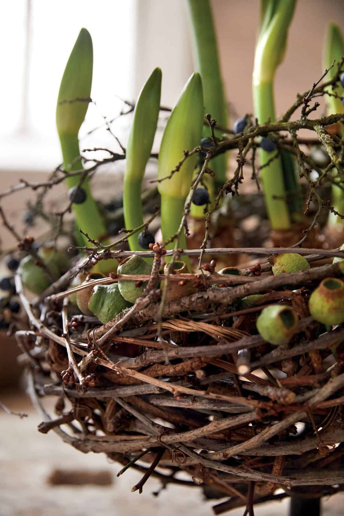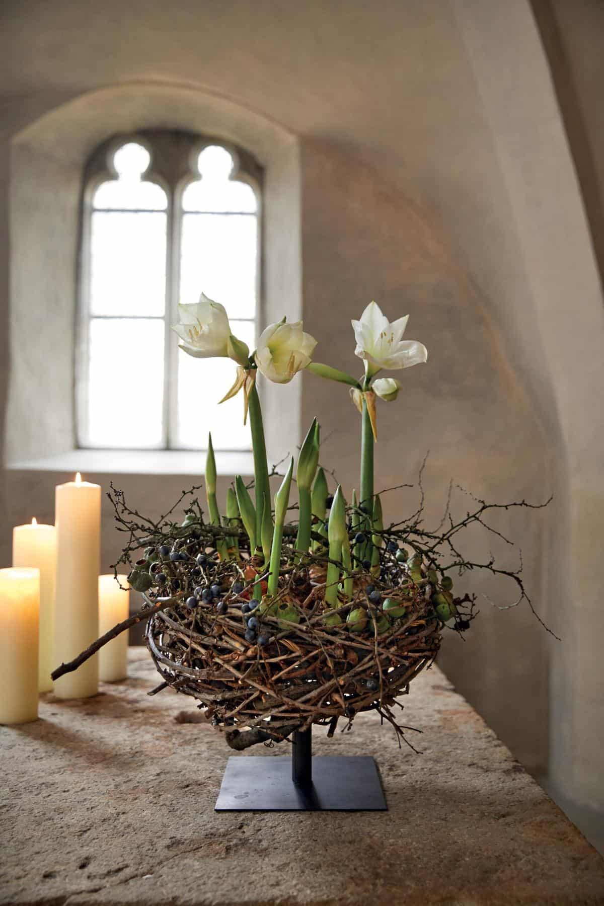Das Korbgeflecht aus Kirschzweigen formen und mithilfe eines Twisters und Rödeldraht fixieren. Im Inneren eine Verstrebung mit Zweigen konstruieren und die ausgewachsene Amaryllis dort einklemmen. Aufgrund der großen Zwiebeln sind Amaryllis prädestiniert, um ausgewaschene und von Erde befreit direkt in das nestartige Zweiggeflecht eingesetzt zu werden. Für den benötigten Feinschliff wird die Floristik mit Schlehenzweigen und Eukalyptus-Früchten verziert. Aufgelegt auf einen Metallständer entfalten sich die Blüten zu prächtigen Winterblüher die schlicht ruhig und apart zur Geltung kommen.