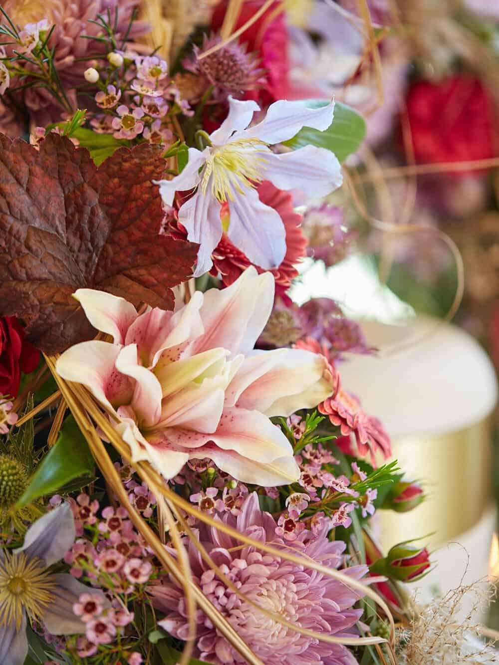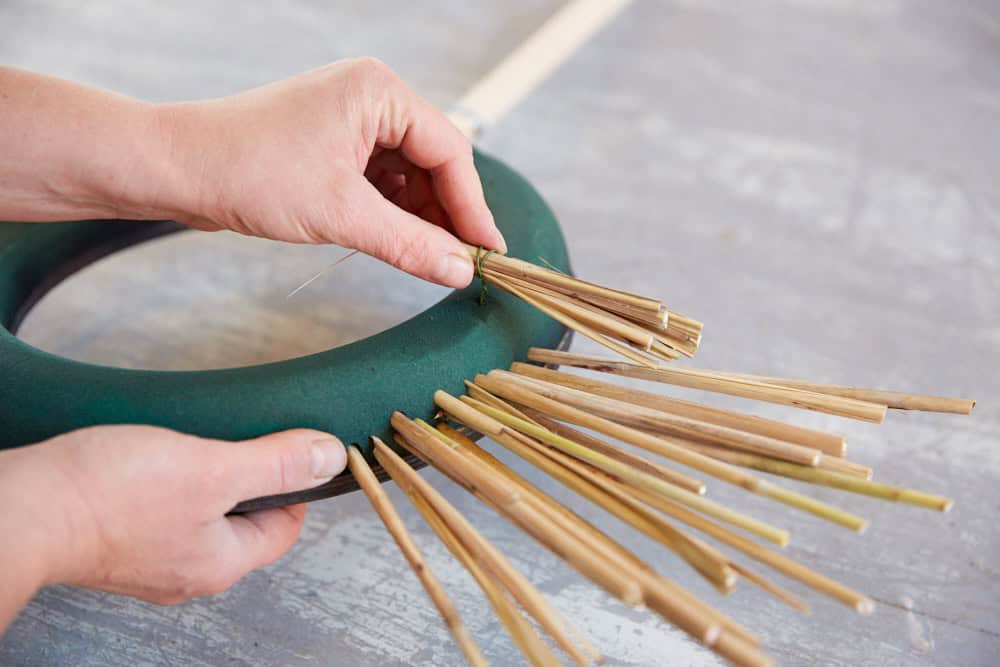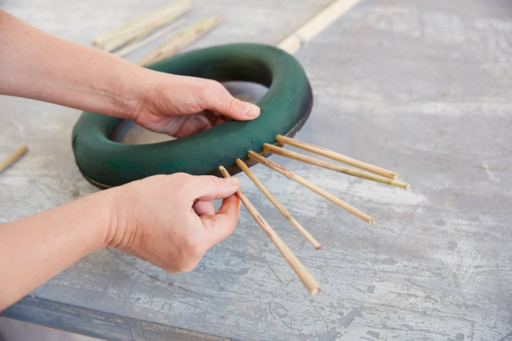 Zunächst die Rückseite des Ringes kolorieren. Dann die Miscanthus-Stiele strahlenförmig in die Außenseite des Ringes stecken und weitere Stiele von Miscanthus zu kleinen Bündel andrahten und auf die Oberseite des Kranzes stecken. Die Floralien nach Belieben anordnen und in den Frischblumensteckschaum-Ring stecken. Den Kranz zum Beispiel an einem Betonfuß-Ständer zur Stabilisierung befestigen.
