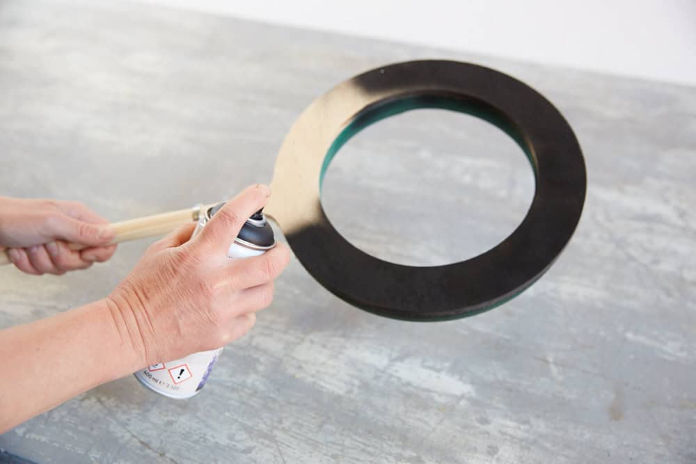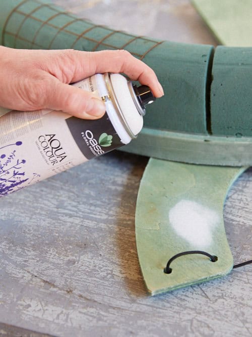 Das Kranzständerwerk mit Spray kolorieren und trocknen lassen. Anschließend den Kranz wässern und den Grund mit Gräsern bestecken, dafür am besten Efeunadeln verwenden. Die Floralien einstecken und bei Bedarf weitere Bündel mit Gräsern ergänzen.