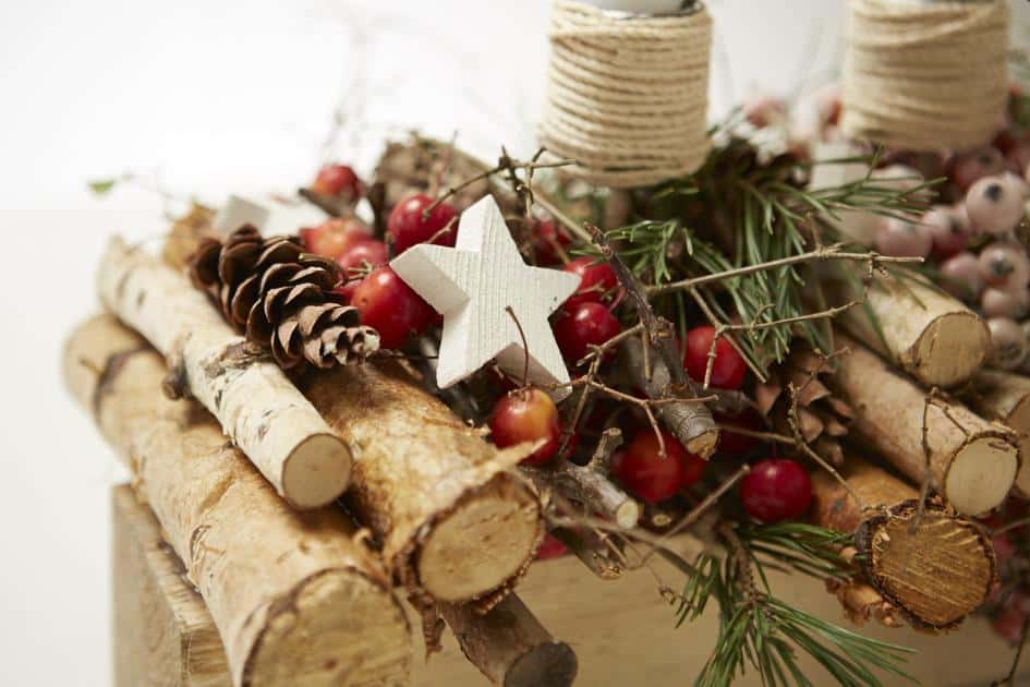 Vier Löcher in das Holzbrett bohren. Die Kerzenhalter mit Kordel umwickeln und mit Heißkleber in den Löchern fixieren. Die langen Kerzen dort einstellen. Viele Löcher für Zweige bohren. Diese auf passende Länge schneiden und einstecken. Hagebutten mit einer Schicht flüssigem Wachs überziehen. Alle Floralien, Zieräpfel und Hagebutten zwischen die Zweige stecken und evtl. mit Heißkleber fixieren. Zum Schluss die Sterne aufkleben.