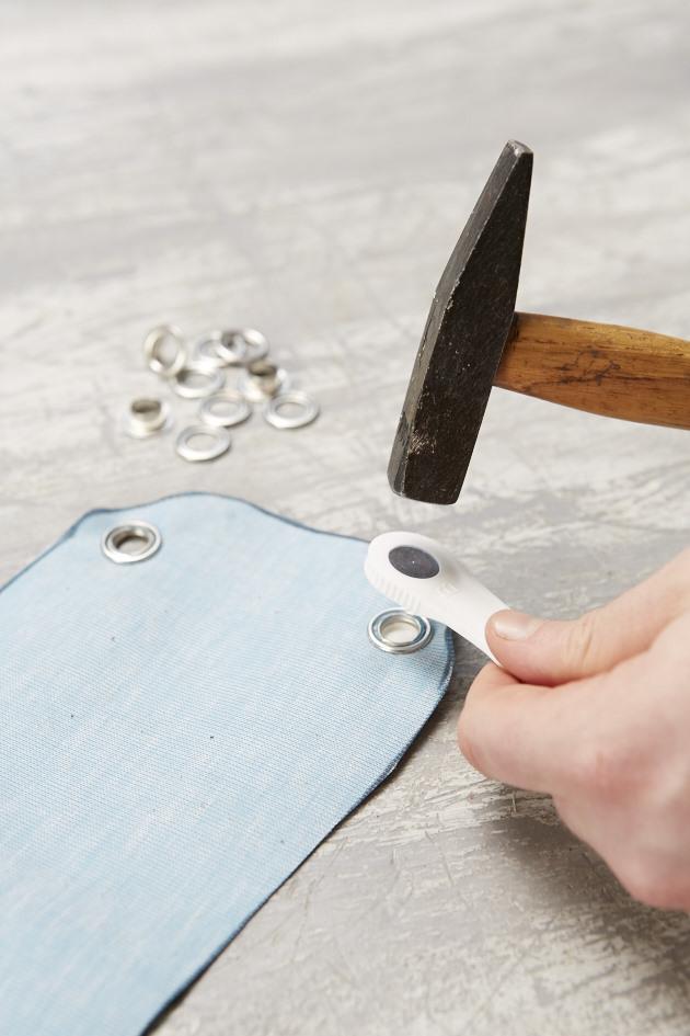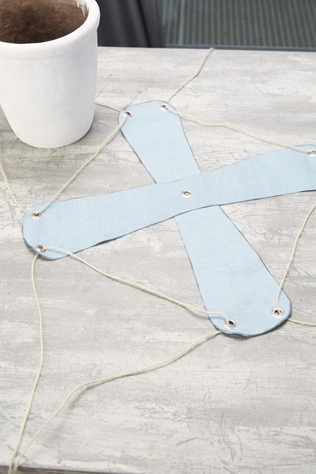 Das Kunstleder zu zwei Streifen zurechtschneiden, die mittig schmal und zu den Enden hin breiter werden, die Ecken abrunden. Diese müssen so lang sein, dass sie gut um das Gefäß passen. Damit beide die gleiche Form erhalten, ggf. eine Schablone verwenden. Die Streifen mittig zum Kreuz übereinander legen. In die Mitte eine Öse und in die Enden jeweils zwei Ösen einstanzen. Jeweils eine Öse mithilfe des Seils mit der nächsten Öse des anderen Streifens verbinden. Den bepflanzten Topf in die Mitte stellen, die Seile anheben und aufhängen.