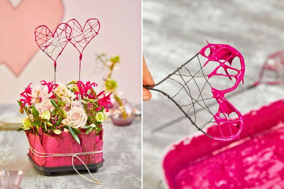 Den Frischblumensteckschaum wässern und den Rand ca. einen Zentimeter breit abschneiden. Platanenrinde mit dem Farbspray ansprühen und zwischen Steckschaum und Schale einstecken. Die Rinde mit einer Schnur umwickeln und Blüten einfügen. Herzen aus Steckdraht und Wickeldraht formen und in beliebige Wandfarbe eintauchen. Gut trocknen lassen und zwischen den Blüten drapieren.