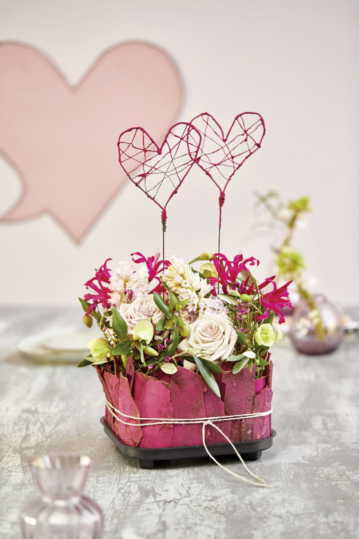 Wie in einem kleinen Garten umringt von einem pinkfarbenen Zaun, lässt die bunte Auswahl der Blüher jedes Herz höherschlagen. Perfekt dazu sind die kleinen Drahtherzen, die dem Gesteck den letzten Schliff verleihen. Für mehr Individualität lassen sich statt Herzen auch Buchstaben formen.