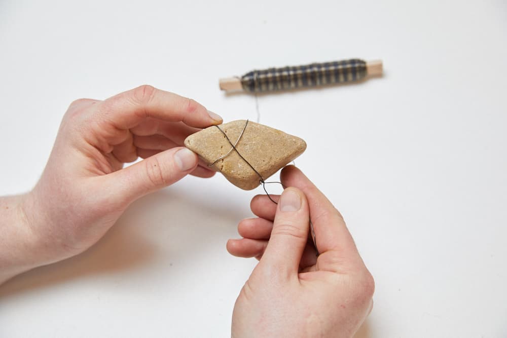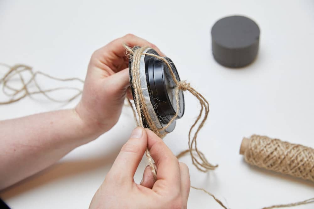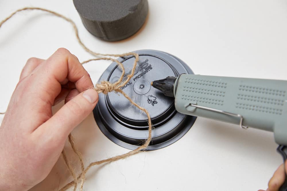 Drei Schnüre auf die gewünschte Länge schneiden und an einem Ende zusammenknoten, dabei einen etwa zehn Zentimeter langen Endfaden beibehalten. Den Dreierknoten mittels Heißkleber auf die Unterseite der Steckschaumschale kleben (1). Rand der Schale mit doppelseitigem Klebeband versehen und Schnur darauf auflegen (2). Einen Stein mit Wickeldraht befestigen (3) und diesen an den Endfaden der Ampel anbringen. Steckschaum wässern, in die Schale setzen und Floralien einstecken.