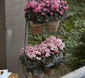 Alte Metallkörbe lassen sich zu tollen Hängeampeln upcyceln. Dafür einfach eine feste Schnur an die Henkel knoten und übereinander aufhängen. Tontöpfe mit Pflanzen wie ’Dancing Pixies‘ bepflanzen und einstellen. Alternativ zu einem Metallkorb lässt sich auch ein ausrangierter Fahrradkorb nutzen.