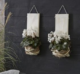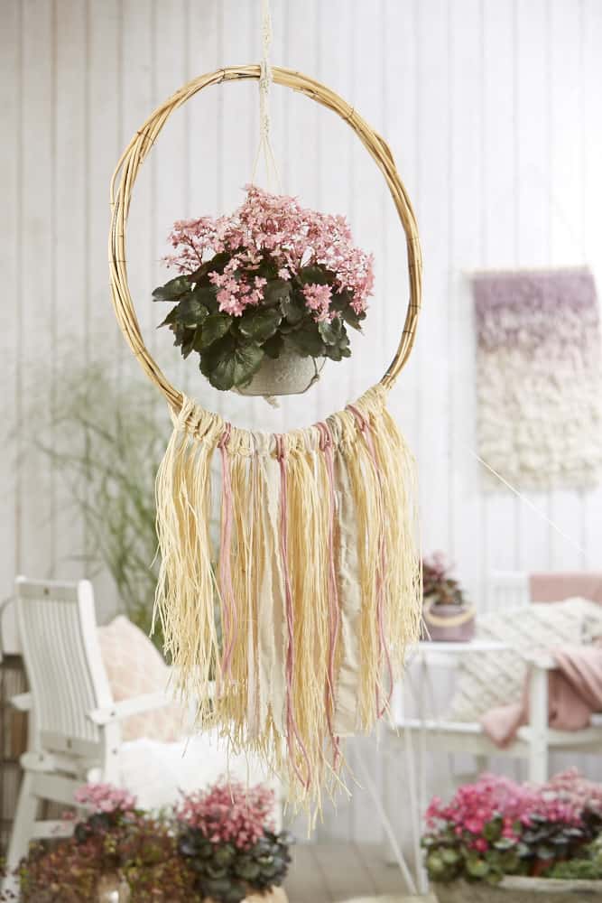 Schwebend präsentiert sich der rosafarbene Herbst-Steinbrech ’Dancing Pixies‘ in einer Makramee-Aufhängung. Der Ring besteht aus einem Dekoreifen, der mit Rattensträngen verstärkt und mit Myrtendraht befestigt wird. Im unteren Bereich des Rings Bast anknoten und lange Fransen hängen lassen. Blumenampel oben am Ring befestigen und aufhängen.