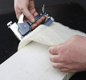 3. Jutestoff in die gewünschte Größe schneiden und wie eine Tasche auf das Brett tackern.