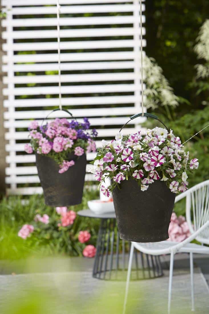 Wer kein Fan vom Boho-Style ist, kann auch die Petunien „Surprice Pink Star“ kombiniert mit Eisenkraut in alte Eimer pflanzen. Diese lassen sich mit einer Kordel ganz einfach aufhängen und können passend zur restlichen Balkon-Deko farblich angepasst werden.
