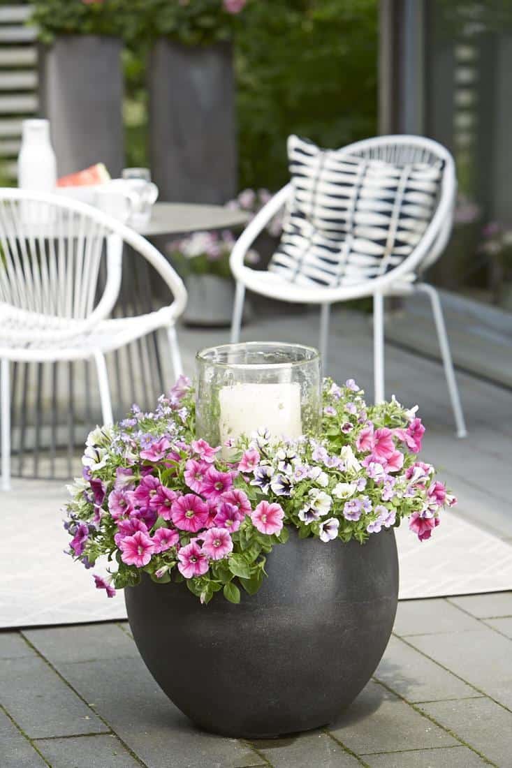 Für einen gemütlichen Sommerabend auf den Balkon sorgt ein romantische Zusammenspiel zwischen Rosa-und Lilatönen der Petunien „Sweetunia Rose Gem“ und „Peppy Blueberry Muffin“. Zusammen mit Lobelien bilden sie einen Kranz um das sich in der Mitte befindende Windlicht. Dazu noch leckere Drinks und gute Musik und die nächsten Sommernächte können kommen!