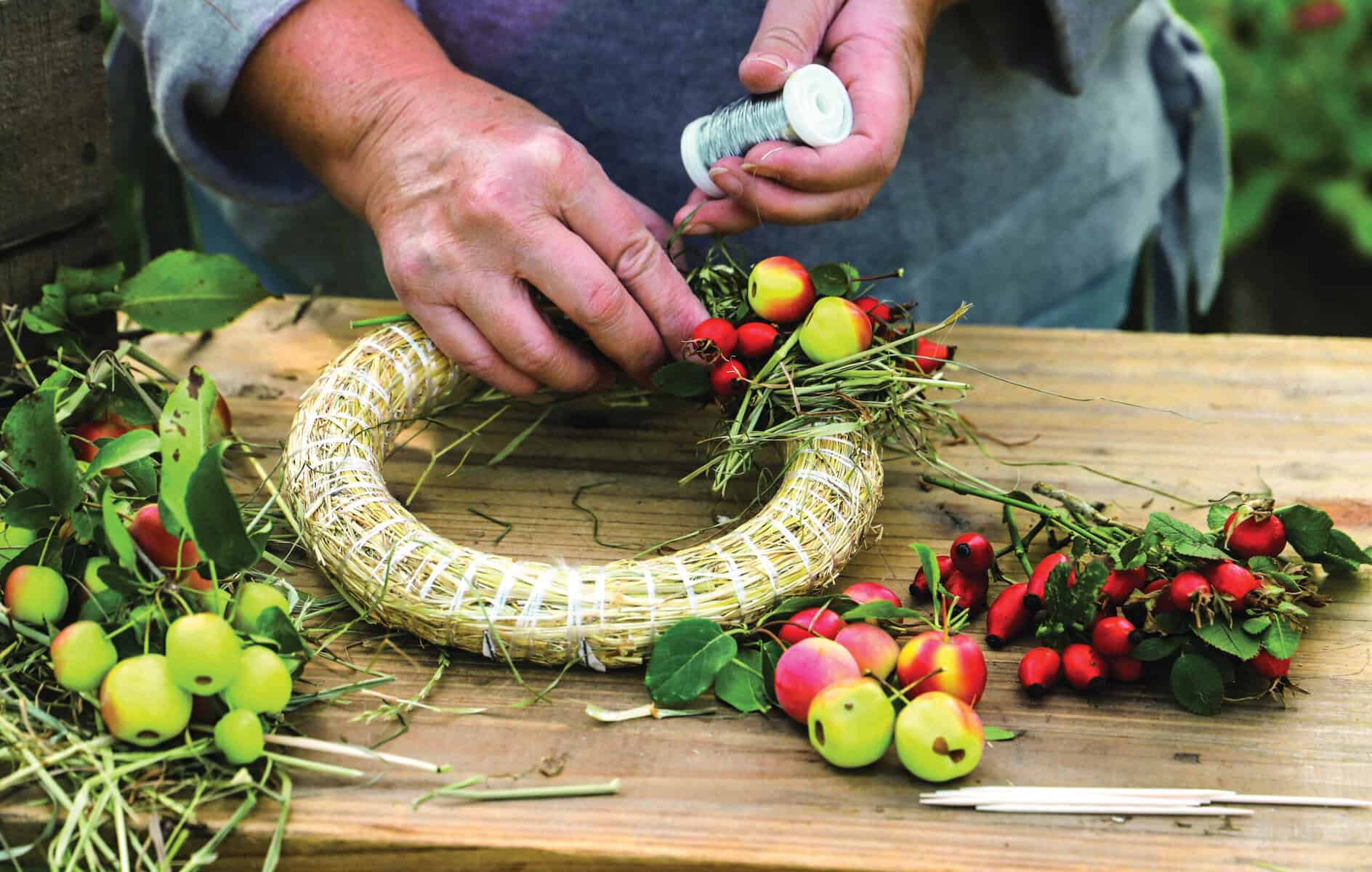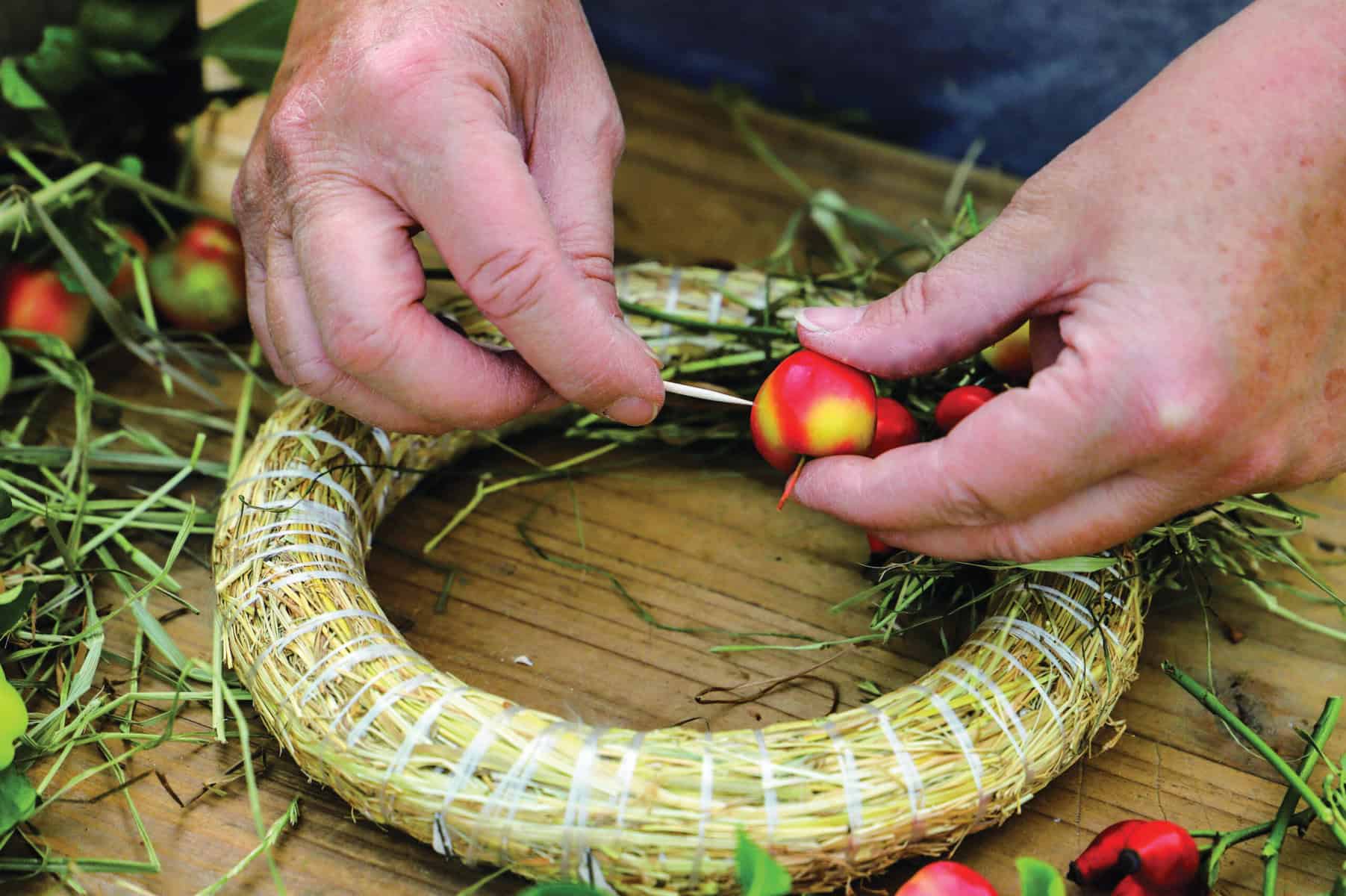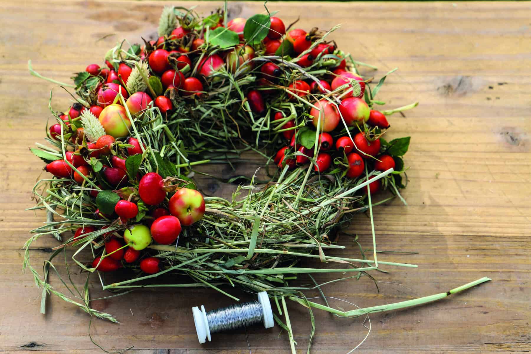 Immer im Wechsel den Strohkranz mit Heubündeln und Hagebuttenzweigen bewickeln. Hierbei muss es keine feste Struktur geben. Stattdessen könnt ihr den Kranz ganz nach Belieben gestalten. Für einen besseren Halt alles mit Wickeldraht fixieren. Die Zieräpfel jeweils mit einem Holzspieß versehen und in den Strohkranz einstecken. Einzelne trockene Gräser dazwischen arrangieren. Auch hier kann bei Bedarf erneut mit Wickeldraht fixiert werden. Den Kranz als Umrandung auf ein Metallgefäß setzen und einen Kürbis in der Mitte platzieren.