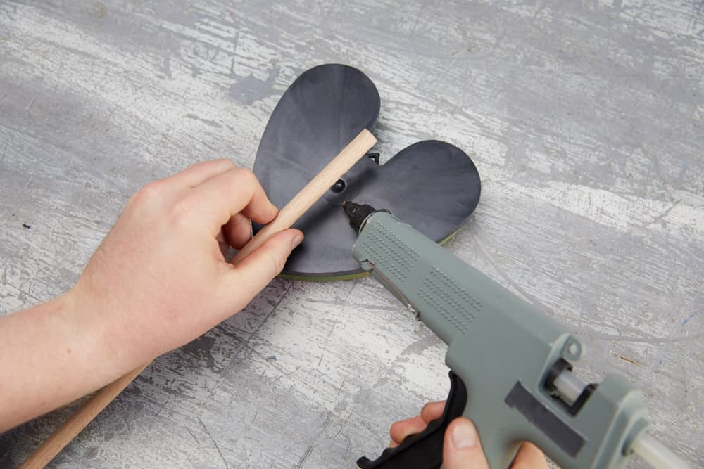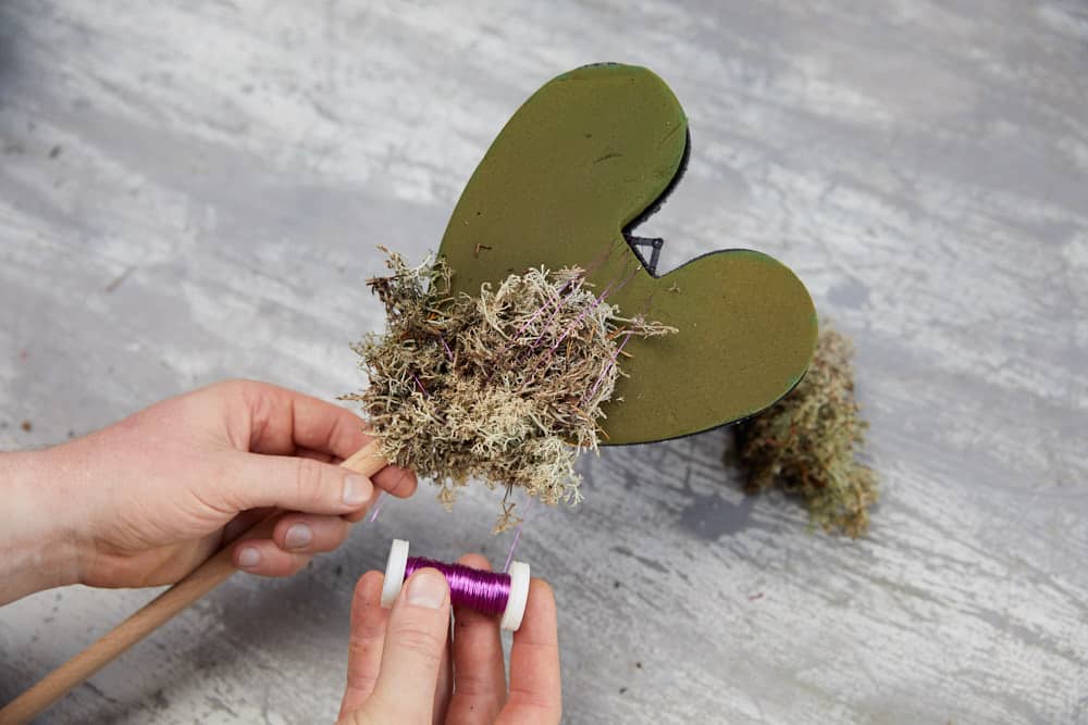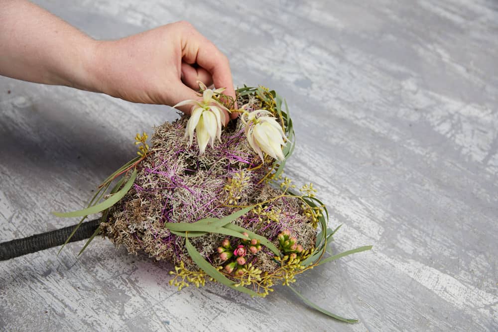Zunächst das FrischblumensteckschaumHerz wässern. Dann das Rundholz mittels Heißkleber auf die Rückseite der Kunststoffschale kleben. Den Stiel des Rundholzes mit Schnur abwickeln. Das Herz mithilfe von Zierdraht mit Flechte bewickeln. Dann Blüten einstecken und Geschenkanhänger sowie ein nach Belieben beschriftetes Band anknoten.