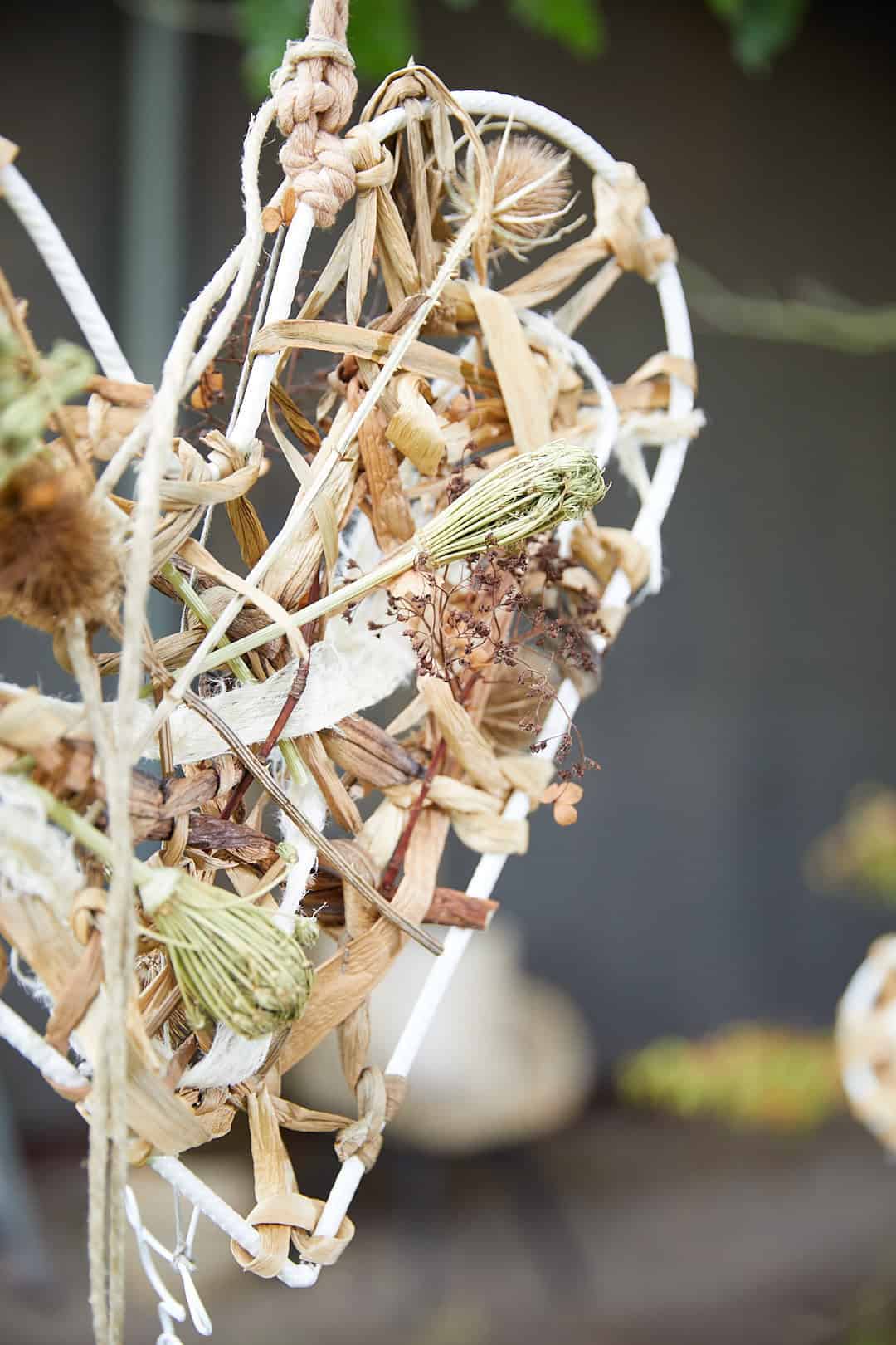 Die Wasserhyazinthenblätter einweichen. Dann Schlaufen aus den Wasserhyazinthen formen und am herzförmigen Gestell befestigen. Die Enden immer miteinander verknoten, sodass eine netzartige Struktur entsteht. Bei Bedarf diese mit Tackernadeln fixieren. Anschließend die Werkstoffe einflechten. Aus dem Aludraht den Schriftzug biegen und mithilfe einer Schnur am Gestell anknoten. Schließlich eine Kordel zum Aufhängen befestigen und das Drahtherz aufhängen.