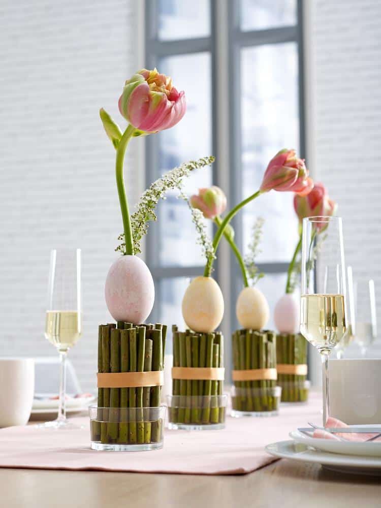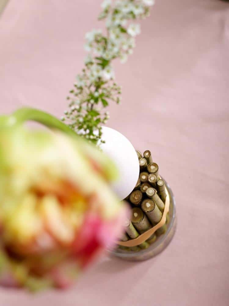 Weidenzweige auf gleiche Länge schneiden, bündeln und mit einem Gummiband zusammen halten. In mit Wasser gefüllte Gläser stellen und das Gummi mit einem Band kaschieren. Oben das Ei, das auf beiden Seiten gelocht ist, aufsetzen. Die Tulpe und Spierstrauch mit ihrem Stiel durchstecken und fertig ist die schnelle Idee.