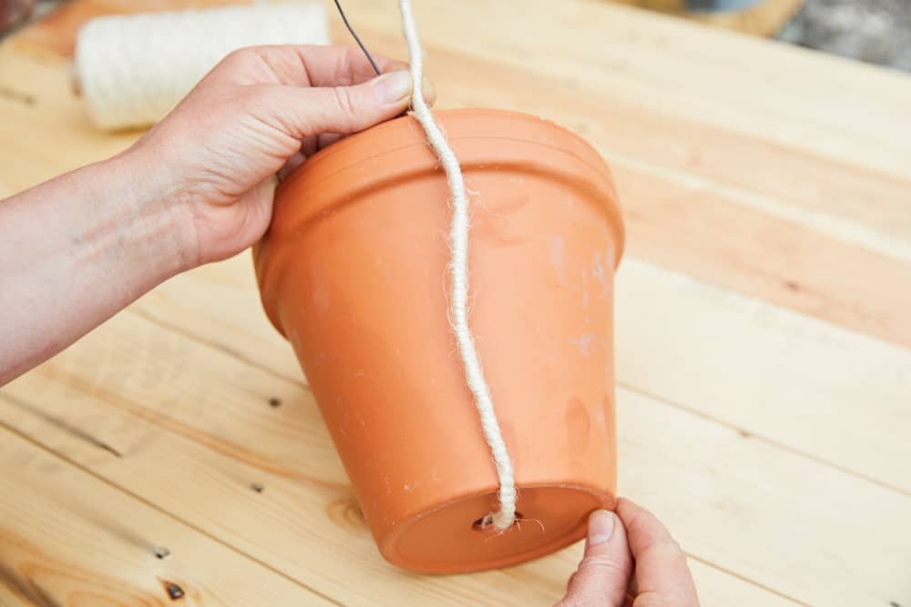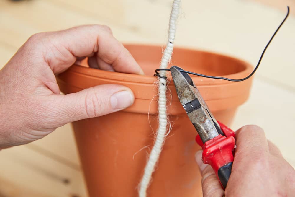 Den Wickeldraht in der gewünschten Länge von der Rolle abschneiden. Rund zwei Drittel des Drahtes mit Schnur eng umwickeln. Dabei darauf achten, dass an den Enden jeweils ein Stück frei bleibt. Den Draht von unten durch das Loch des Tontopfes ziehen und seitlich befestigen. Dann ein Herz formen  und die Geranienpflanze in den Topf einsetzen. Zusammen mit anderen so gestalteten Gefäßen in einer bemalten Holzkiste arrangieren.