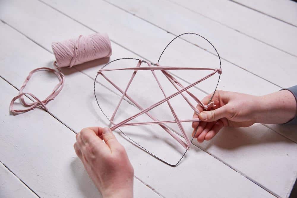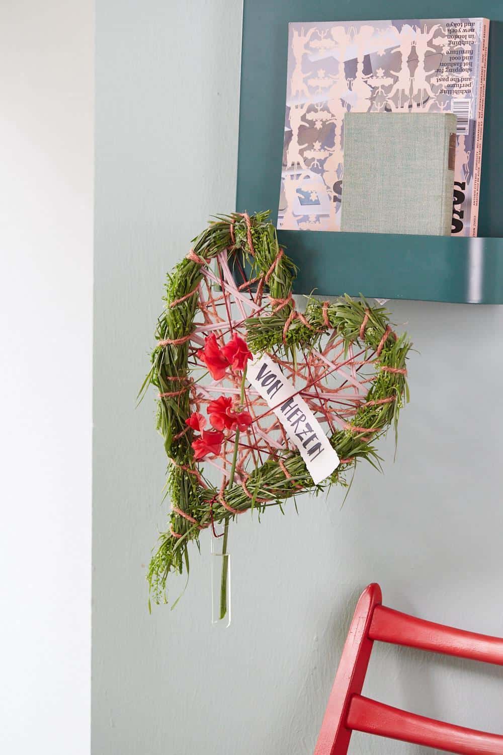Wellendrahtherz kreuz und quer mit Schnüren bewickeln. Die Außenkante locker mit Wiesengras und Acker-Hellerkraut bewickeln. Reagenzglas festbinden und Blüte einstellen. Geschenkanhänger mit Botschaft in das Schnurgeflecht einstecken. Ein längliches Stück Hasendraht mit Wiesengras und Acker-Hellerkraut bewickeln. Diesen Streifen um das Gefäß knicken und mit Schnur fixieren. Daran Geschenkanhänger anknoten. Dann die Blüten locker ins wassergefüllte Gefäß einstellen.