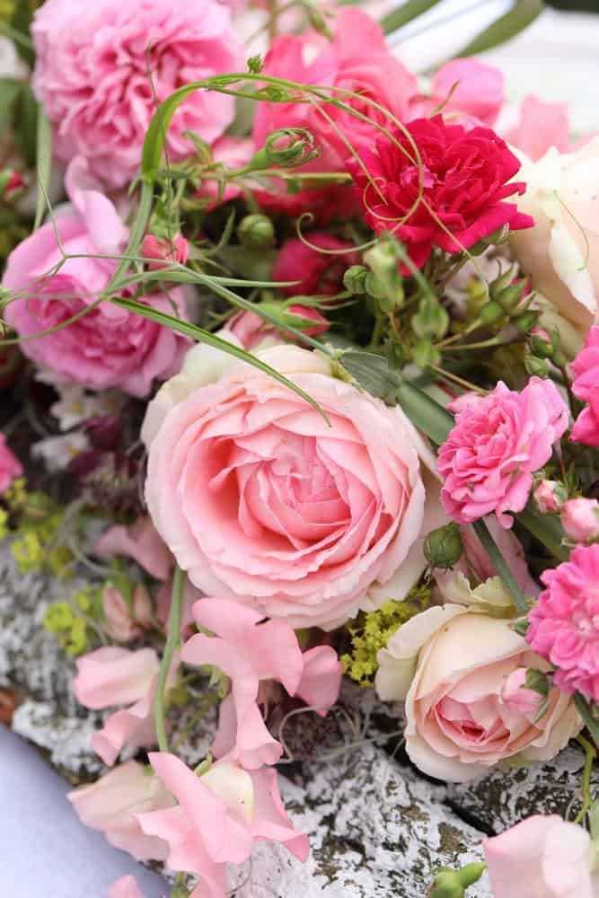 Für dieses Blumenfries die Schalen, in denen sich der gewässerte Frischblumensteckschaum befindet, auf einem Brett platzieren und seitlich geweißte Rindenstücke mit Nägeln befestigen. Dann ein paar Ranken und Triebe verschiedener Rosenstöcke in längliche einstecken. Auf einem länglichen Tisch drapiert, wirkt es nun so, als würden rosa- und pinkfarbene Blüten aus einem verwitterten Baumstamm wachsen.
