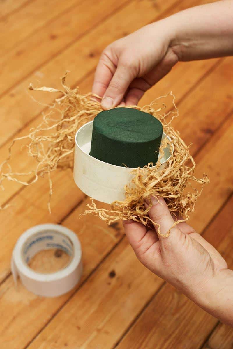 Das braucht ihr: Kunststoffschale mit gewässertem Frischblumensteckschaum, Chrysantheme, Seidenpflanze, Moos, Aststück, künstliche Pilze, Wolle, Maulbeerbaumrindenfaser, Myrtendraht, Heißkleber, doppelseitiges Klebeband