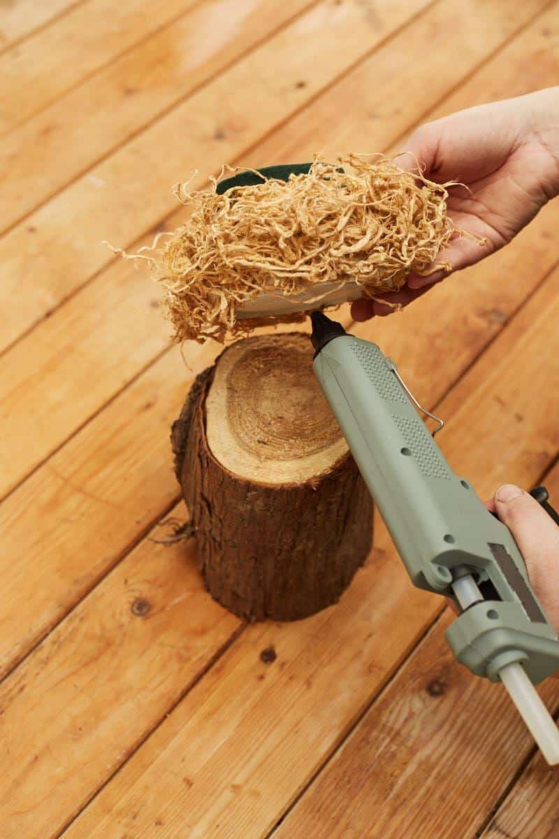 So wird’s gemacht: Kunststoffschale mit gewässertem Frischblumensteckschaum mit doppelseitigem Transparentklebeband versehen und Maulbeerbaumrindenfaser aufkleben (1). Steckschaumschale auf ein Aststück kleben (2). Schale bestecken und das Aststück mithilfe von Draht mit bemoosten Zweigstücken sowie mit Wolle und künstlichen Pilzen weiter ausgestalten.
