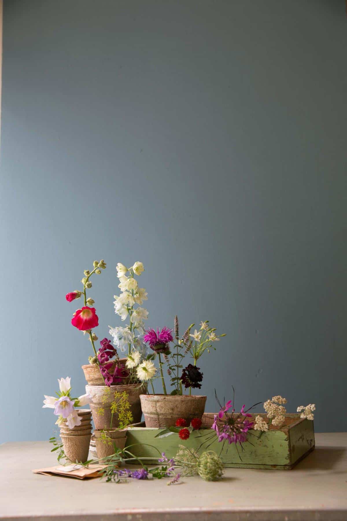 Die Floralien wie beispielsweise Rittersporn, Stockrose und Glockenblumen locker zusammen nehmen und mit Bindebast festbinden.