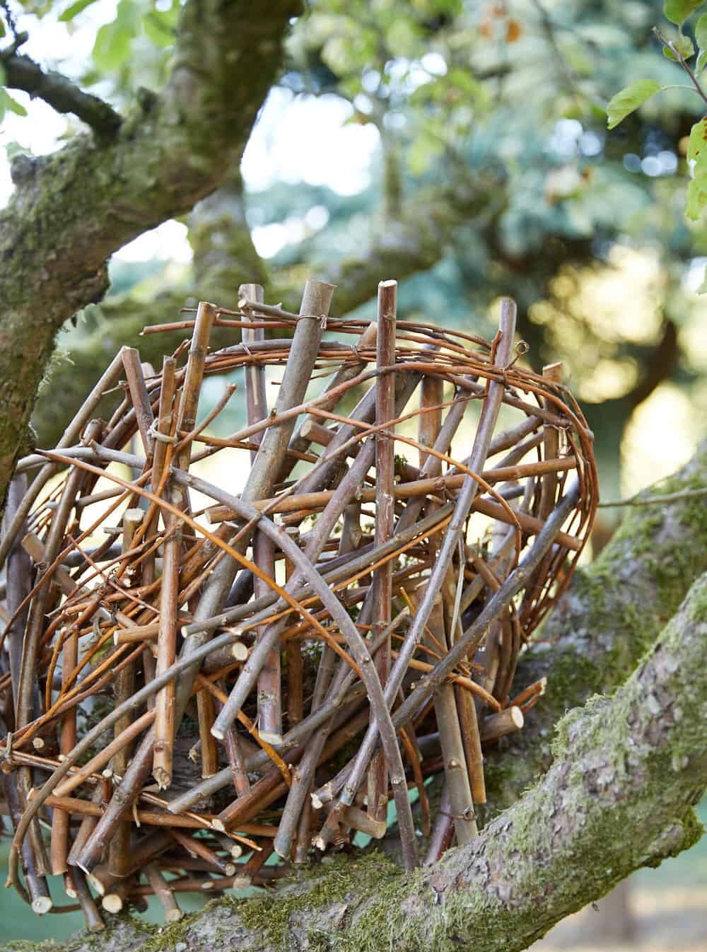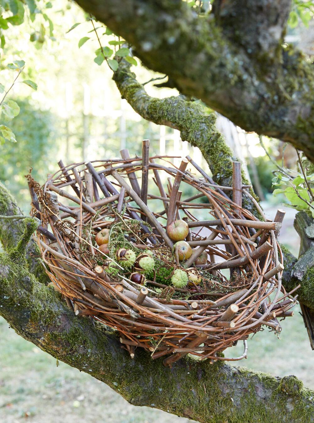 Beim Anblick dieser Nestkonstruktion könnte man meinen, dass ein großer Vogel mit Vorlieben für Kastanien, Farn und Zieräpfeln nistet. Das Nest besteht aus mehreren Zweigen, die mithilfe eines Twisters und Twisterdraht miteinander verrödelt sind. Ein bemooster Ast dient als Grundlage für die herbstlichen Früchte und den Farn.