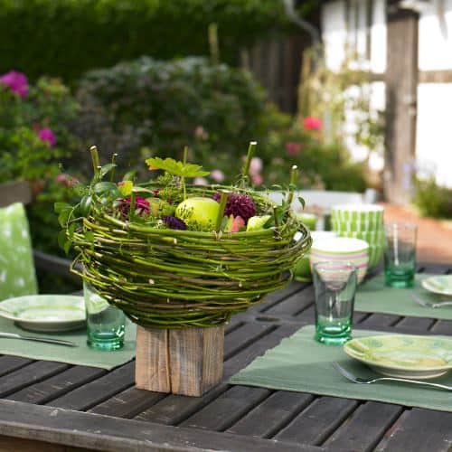 Körbe repräsentieren einen wesentlichen Aspekt des ländlichen Lebens, Arbeitens und Wirtschaftens. In ihnen wird nicht nur das Erntegut vom Garten oder Feld ins Haus getragen. Sie dienen auch als Behältnisse für vielerlei andere Produkte – wie Holzscheite, Lebensmittel, Heu oder Stroh. Und so vielfältig ist auch ihre Erscheinungsform, denn sie werden aus den unterschiedlichsten Materialien in Handarbeit hergestellt. Korbflechtung ist eine der ältesten handwerklichen Tätigkeiten der Menschheit, die auf der ganzen Welt verbreitet ist. folgenden Ideen basieren auf dem für Körbe typischen Herstellungsprozess des Webens und Flechtens. Das inspiriert zu auffälligen Gestaltungen mit Weidenzweigen und Rinde, die mit frischen Äpfeln und herbstlichen Blüten ein gelungenes Zusammenspiel ergeben.