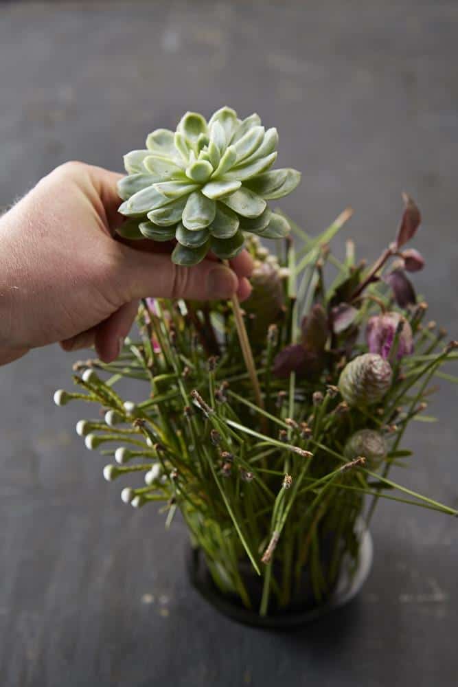 - Ist der Rand der Unterlage komplett besteckt, im oberen Drittel weitere Piniennadeln kreuz und quer einschieben. Blüten und Kapgrün dazwischen arrangieren. Die Unterseite der Echeverie mit einem Holzstab versehen und als zentralen Punkt in dem Gesteck platzieren. Verschiedene Glasschmuckelemente nach Belieben festkleben.