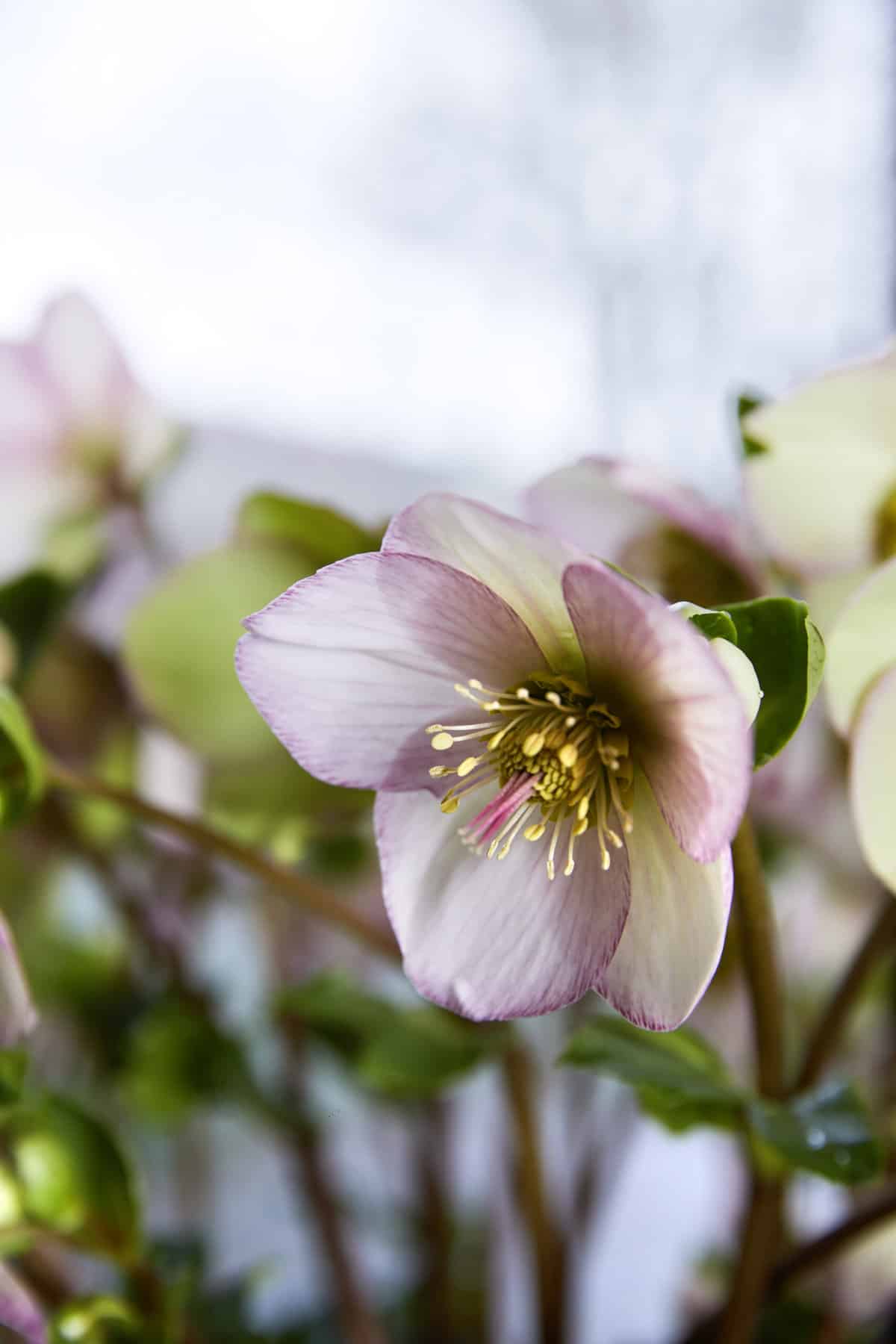 Auch als Hängeampel ist die Schneerose ein echter Hingucker. Hier ist sie in einen Korb gepflanzt, der mit Schnüren an einem Dekoring befestigt ist. Dieser wurde zuvor mit diversen Grünzweigen bewickelt.