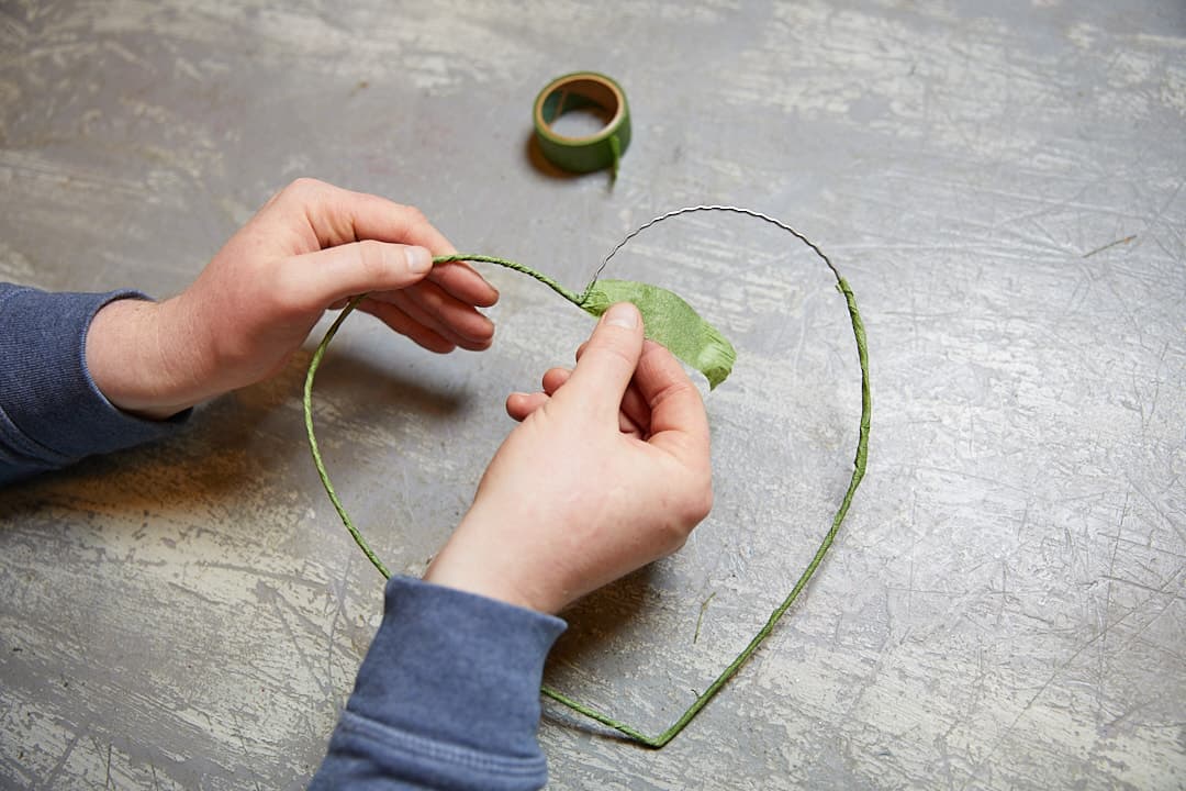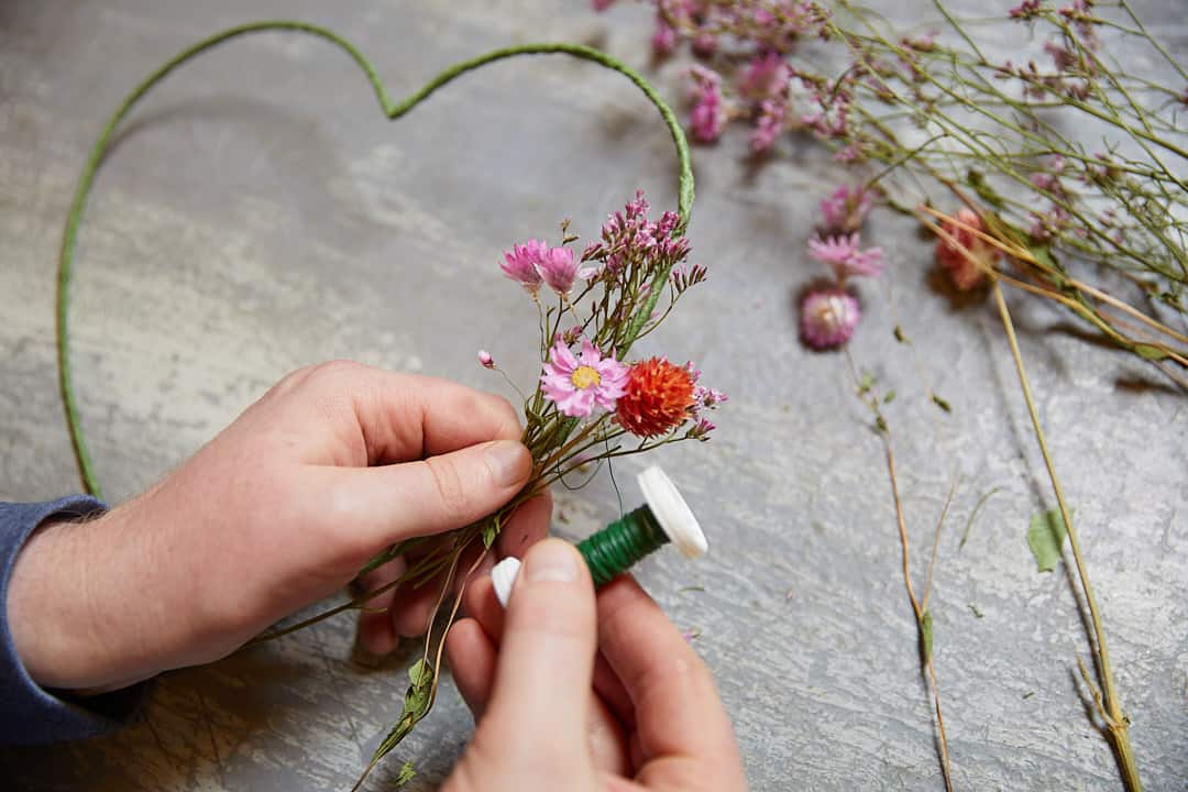 Das Wellendrahtherz mit grünem Kreppband umwickeln. Die Blumen mit Myrtendraht auf das Wellendrahtherz binden bzw. wickeln. Dann ein Band als Aufhängung anbringen und das fertige Herz am Fenster befestigen.