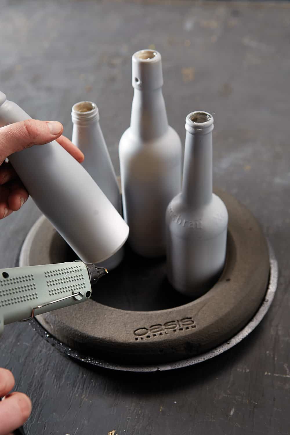 Zunächst die Flaschen kolorieren (1). Nach dem Trocknen diese in der Mitte des gewässerten FrischblumensteckschaumRings einkleben (2) und mit Schnur, Kerzen und Anhängern dekorieren. Den Steckschaum mit auf Holzspießen befestigten Hauswurzpflanzen, Lärchenzweigen und mehr bestecken. Zum Abschluss einen großen Stern auflegen.