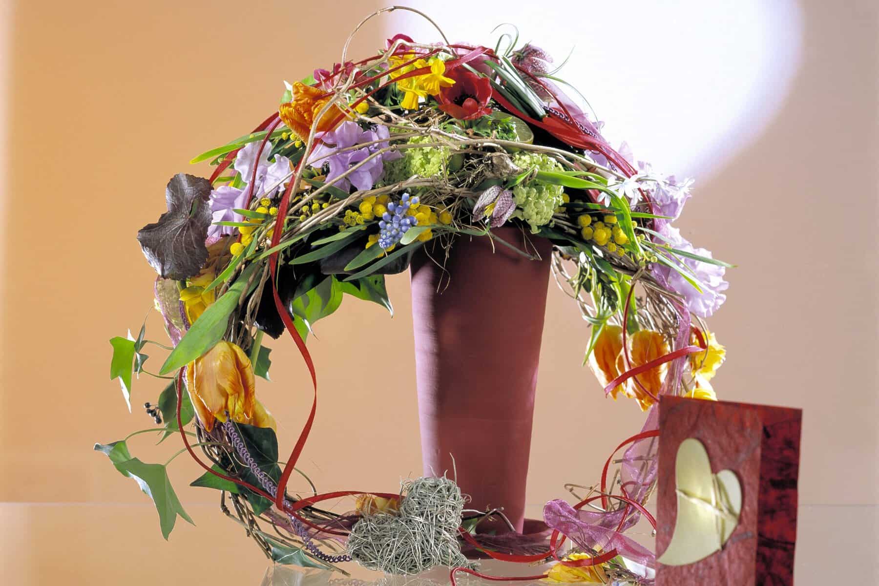 Durch biegsame Werkstoffe, wie Efeuranken, lange Tulpen oder weiche Zweige, sind die seitlichen Bögen besonders gut herausgearbeitet. Je schwungvoller diese sind, desto eleganter und gekonnter wirkt der Strauß. Aus der stärker ausgearbeiteten Basis bzw. Straußmitte heraus verjüngen sich die Bogenarme zu ihrem Ende hin.