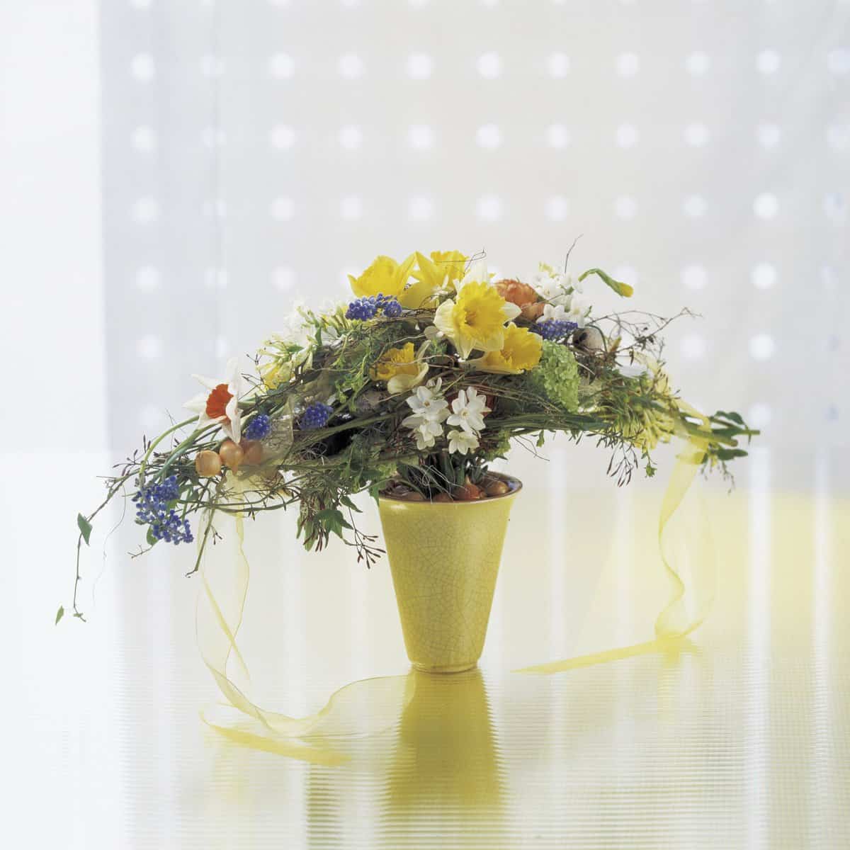 Deutlich zu sehen: In der Straußmitte, der Basis, werden die Werkstoffe dichter und fülliger angelegt, damit sich die lang ausschwingenden Triebe nach außen spreizen.
