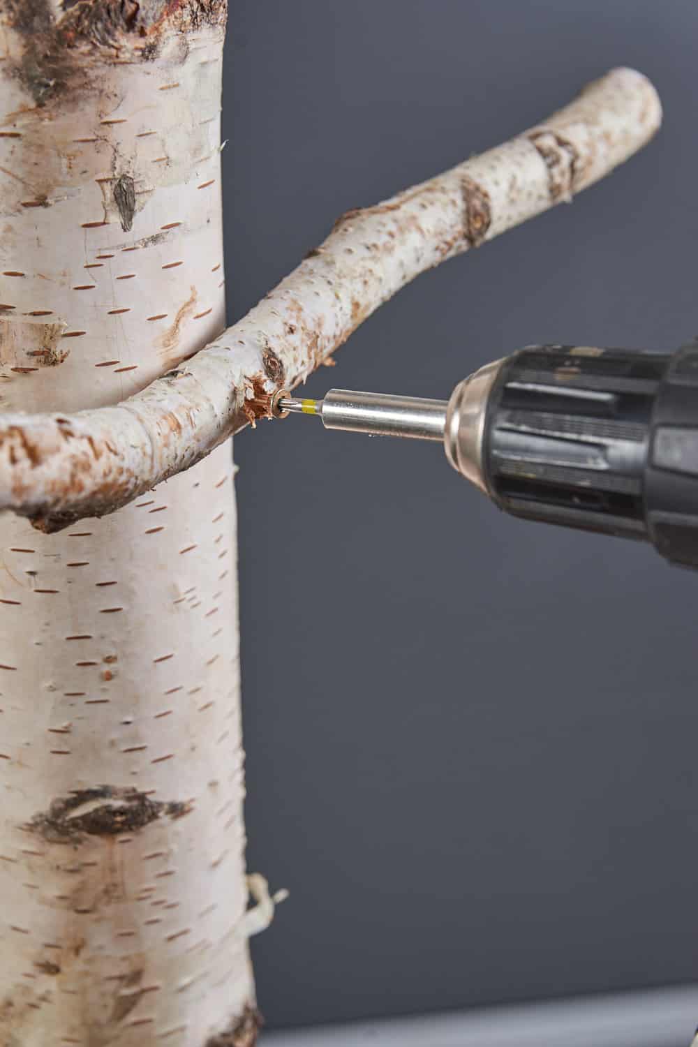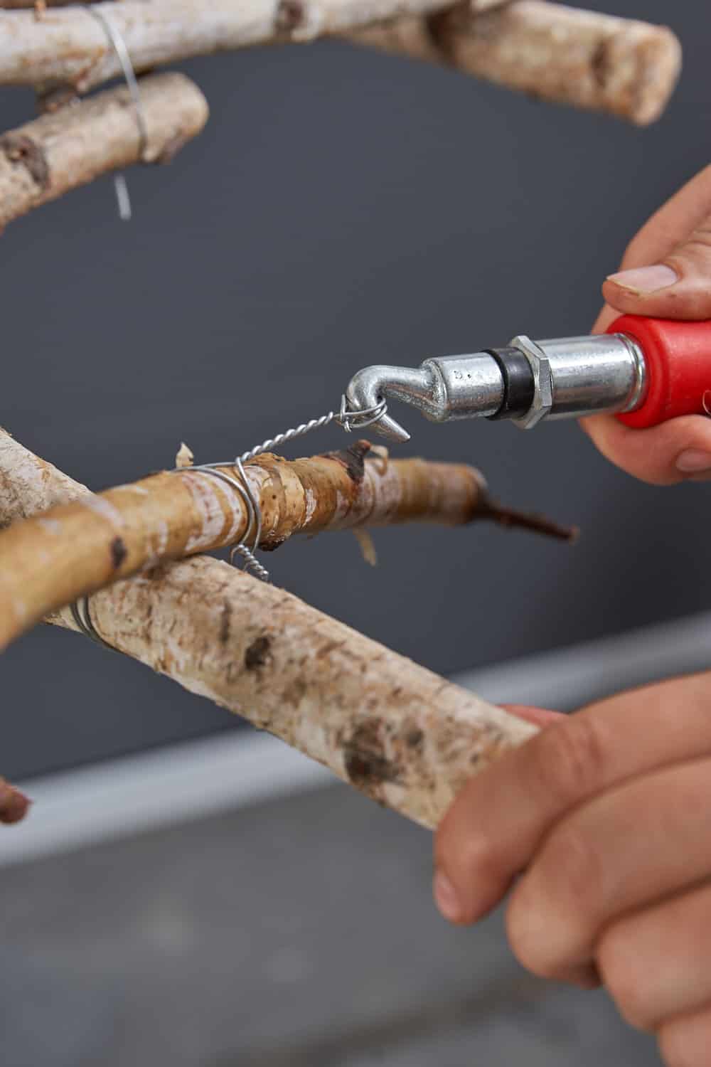 Birkenäste von ca. 80 Zentimeter Länge in gewünschter Höhe an den Stamm schrauben. Weitere Äste mit Drilldraht befestigen. Rankenkranz auflegen und mit den Kerzen sowie Bändern, Accessoires und weiteren Floralien versehen.