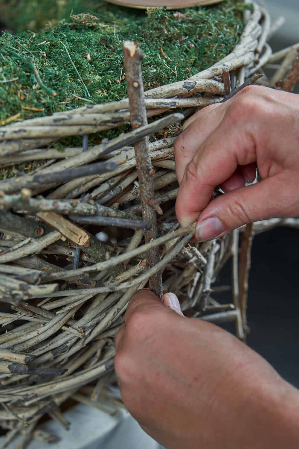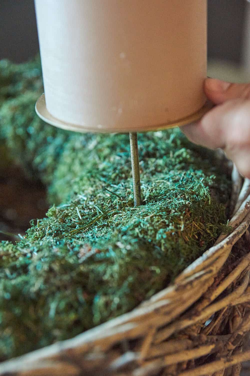 Pflanzgefäß als tragende Säule verkehrtherum aufstellen. Korb daraufstellen und herabhängende Zweige in das Korbgeflecht klemmen. Mooskranz in den Korb einsetzen und Kerzen mit Kerzentellern einstecken. Zapfen, Sternaccessoires etc. ergänzen.