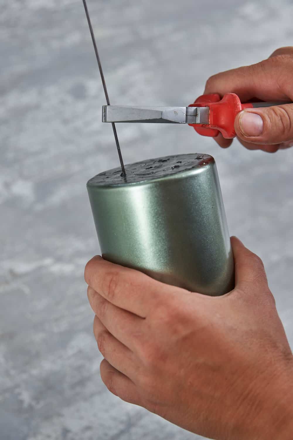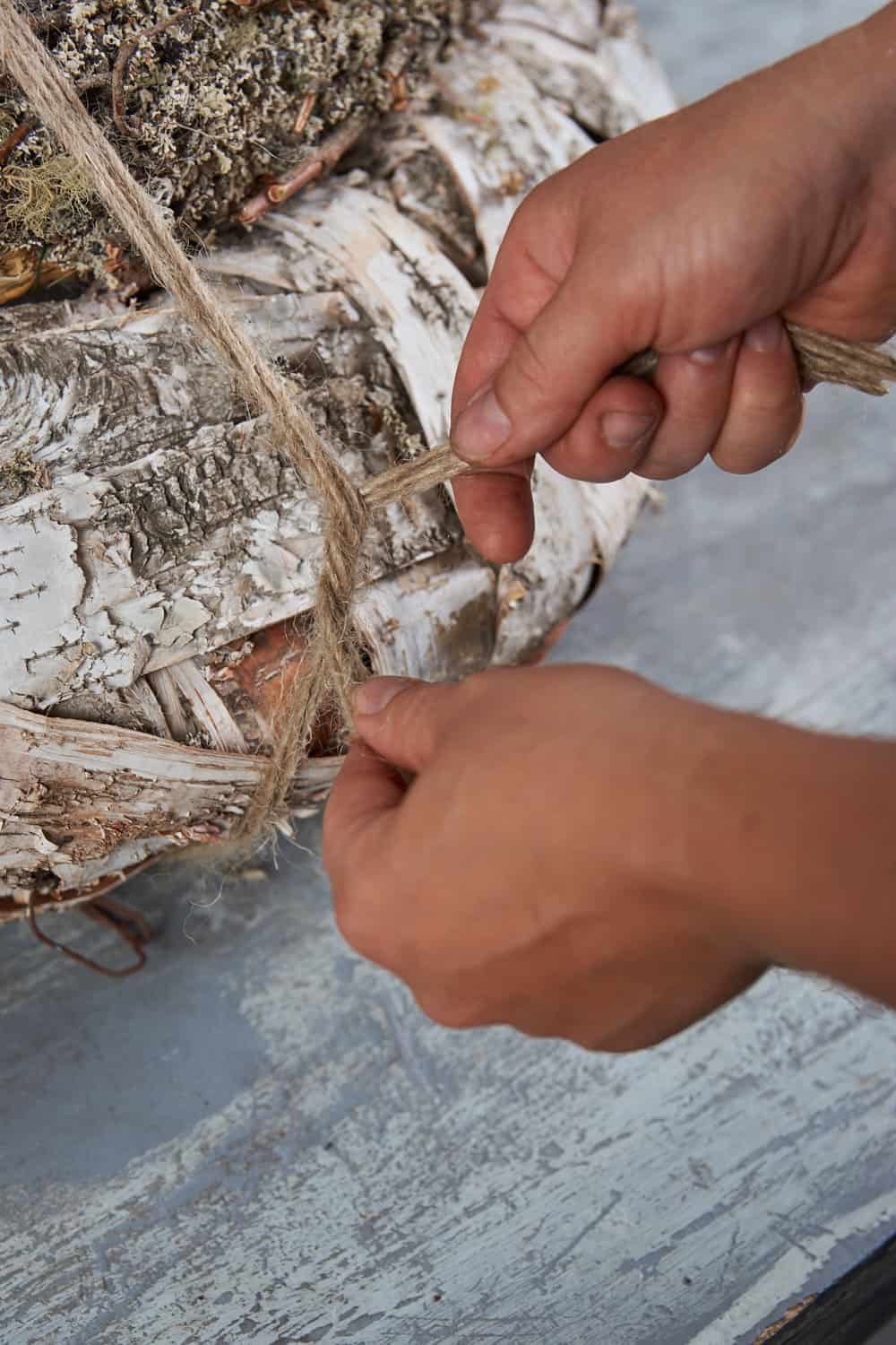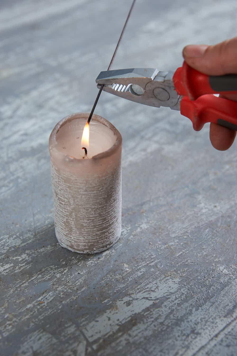 Flechtenzweigkranz auf einem Birkenrindenkranz mit Steckdraht fixieren und diese Kranzbasis mit Kordel aufhängen. Steckdrähte zum Andrahten der Kerzen jeweils an einer Kerzenflamme erhitzen. Dann je Kerze drei bis vier Drähte vorsichtig etwa zwei Zentimeter tief in den Kerzenboden stecken und diese damit auf dem Flechtenkranz fixieren.