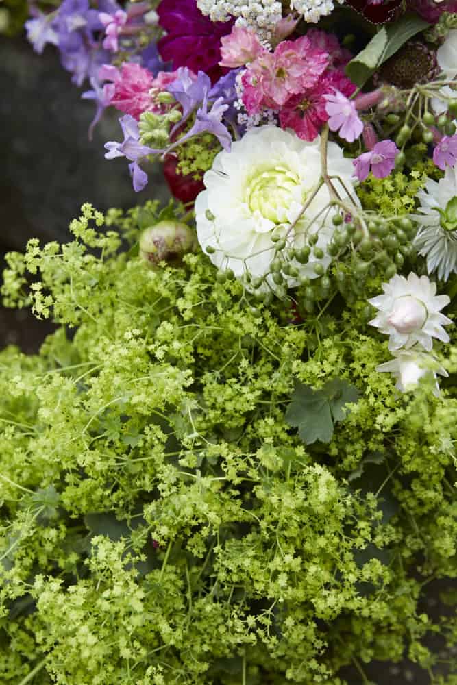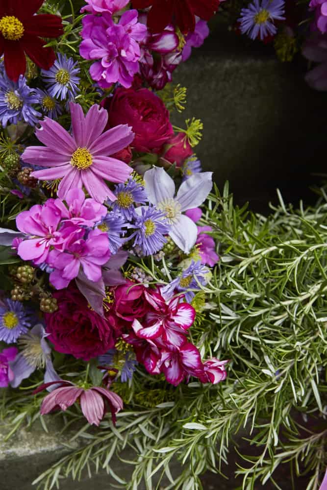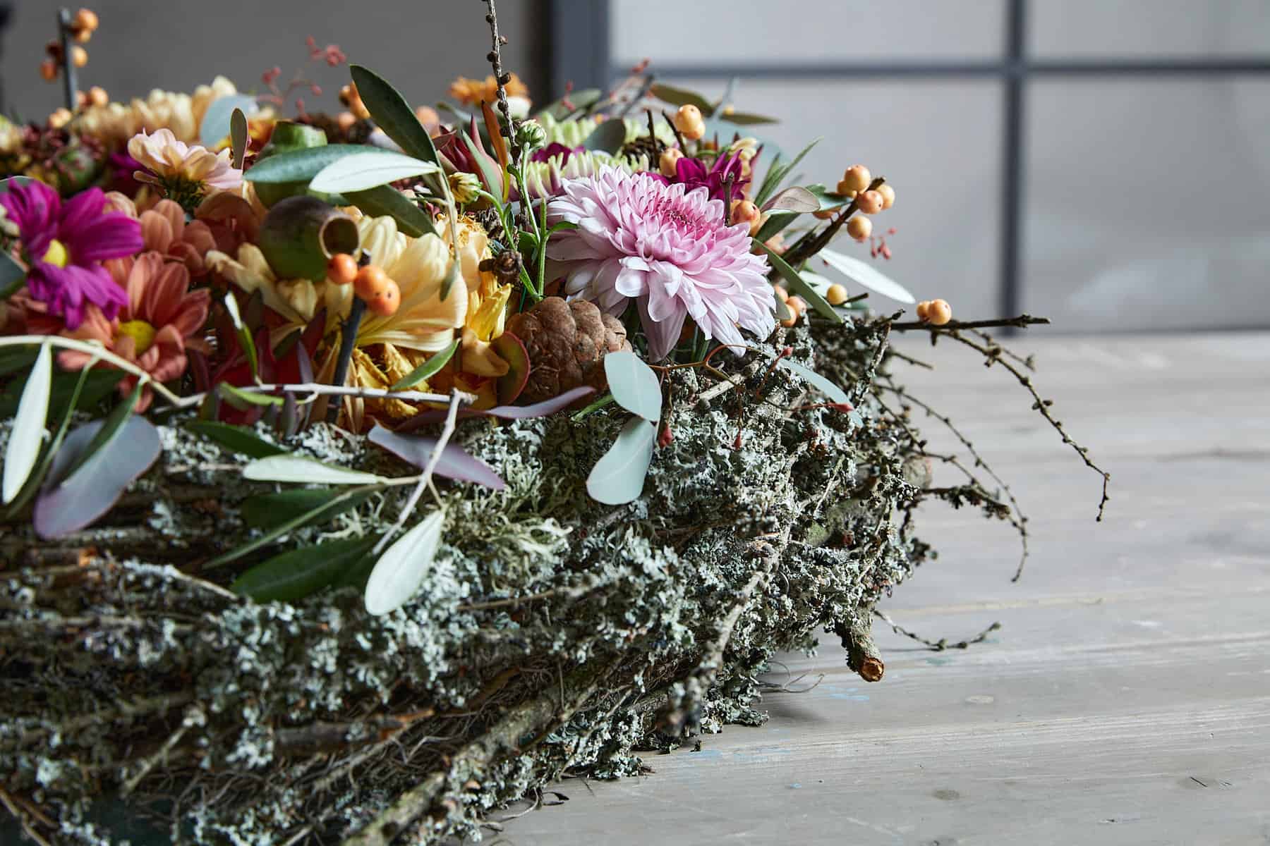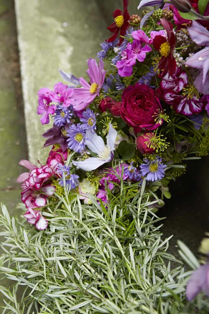Ein Abschiedskranz für die geliebte Mutter, für den fürsorgenden Vater oder das Familienoberhaupt. Passend dazu die Abschiedsworte auf dem Schleifenband: Wir sind traurig, dass Du nicht mehr da bist, aber dankbar, dass Du bei uns warst! – We grieve your loss, but thankful you were here! Frauenmantel, das grünliche Kraut mit den beschützenden Blättern, steht hier symbolisch für das Liebenswerte und das, was ein Mensch für andere bedeutet hat. Dazu aber auch Vielfalt, Buntheit, Freude, was das Drittelsegment mit dem Blumenmix ausdrückt.